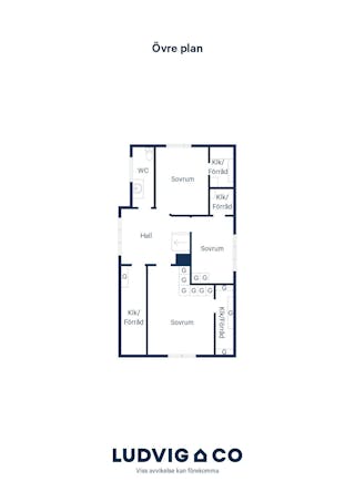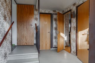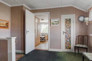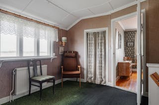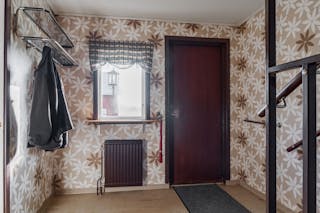 Möblerbar hall med ingång till vindsförråd. Heltäckningmatta.