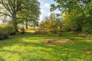 Lummig trädgård med fruktträd, bärbuskar och ett äldre växthus.