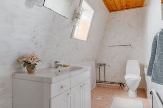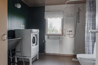 Badrum utrustat med dusch, wc, tvättställ, tvättmaskin, tvättho, garderober och ytskikt med våtrumsmatta.