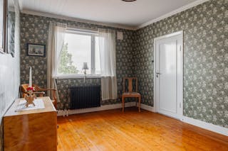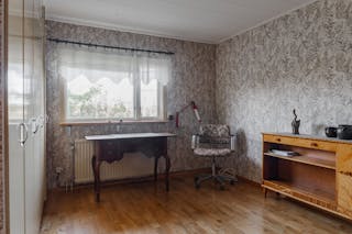 Kontor/sovrum med parkettgolv och garderobsvägg.
