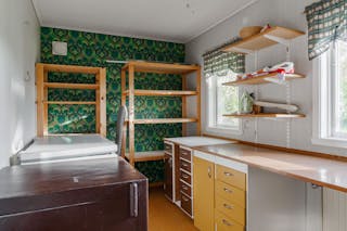 Syrum med skåpsinredning och bänk samt kassaskåp och frysbox.