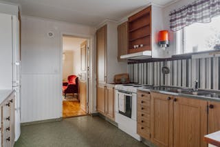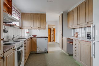 Köket är utrustat med spis, fläkt, diskmaskin, kyl/frys, väggar med bröstpanel och plastmatta på golvet.