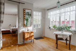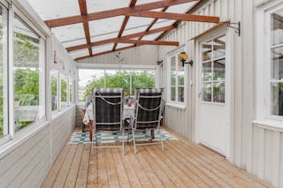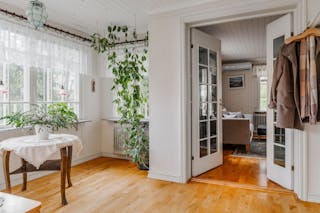 Vacker glasveranda/hall med spröjsade fönster och ekparkett på golvet. Härifrån nås trappa till övre plan.