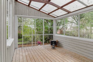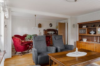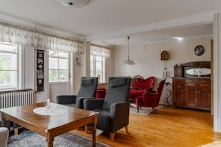 Vardagsrum med ekparkett på golvet och utgång till inglasad altan med tak av kanalplast.