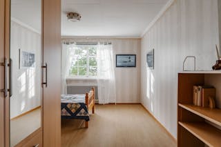 Mindre sovrum med parkettgolv, garderober och vindsförråd.