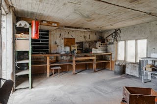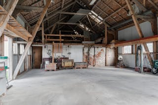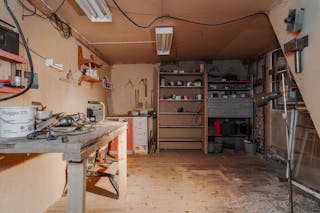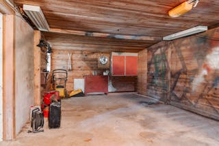 Byggnaden inrymmer mindre verkstad och garage med fjärrstyrd port. Byggnaden har gjutet golv, murad stomme och delvis i trä, fasad och tak är av plåt.