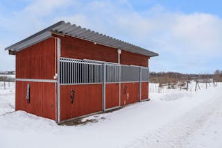 "Privatstallet" sitter ihop med stora stallet men man måste gå några meter ute för att komma in. Gjuten platta, trästomme, plåttak. Här finns 5 boxar. Nyrenoverat invändigt. Det finns vatten och vattenkoppar till alla hästar.