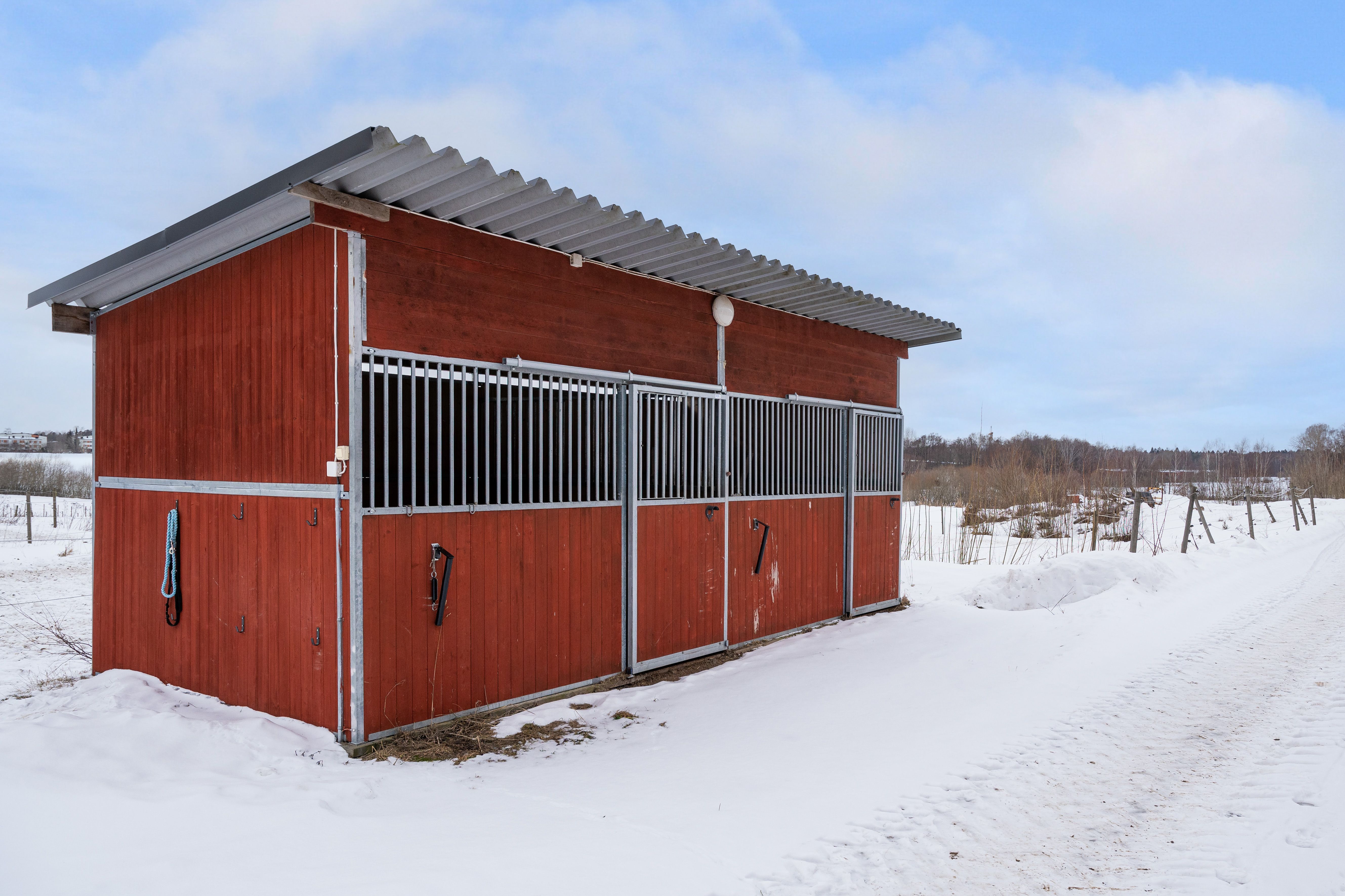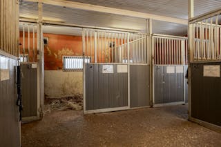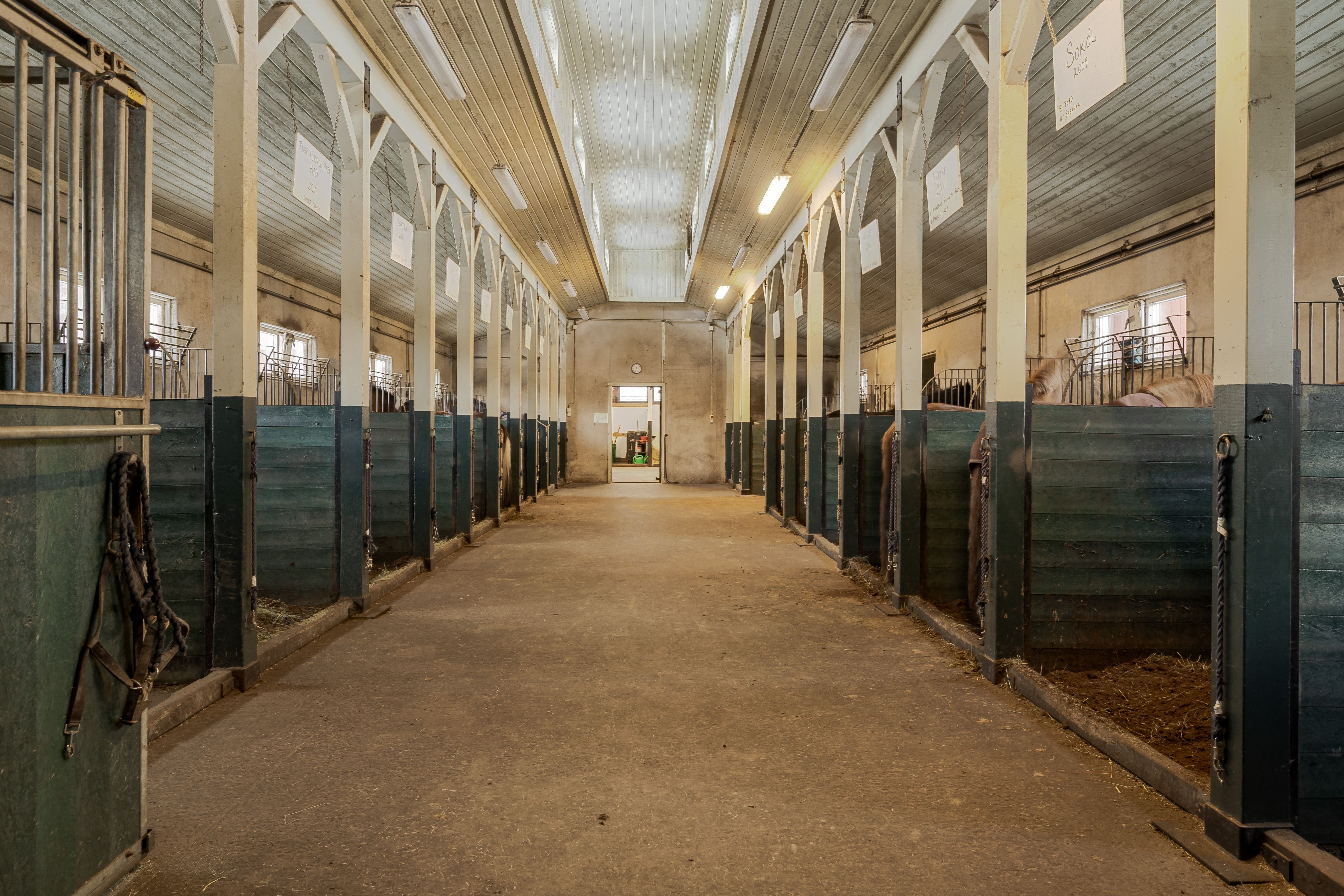 I stallet finns fyra boxar varav 2 stora och 2 mindre. Här finns också många spiltor, sadelkammare ventilerad med fläkt (ej uppvärmt) samt foderkammare. Alla hästar har vatten och vattenkoppar.