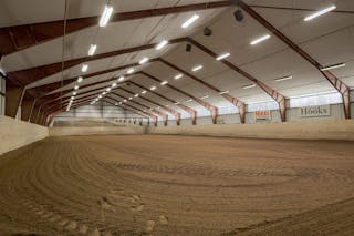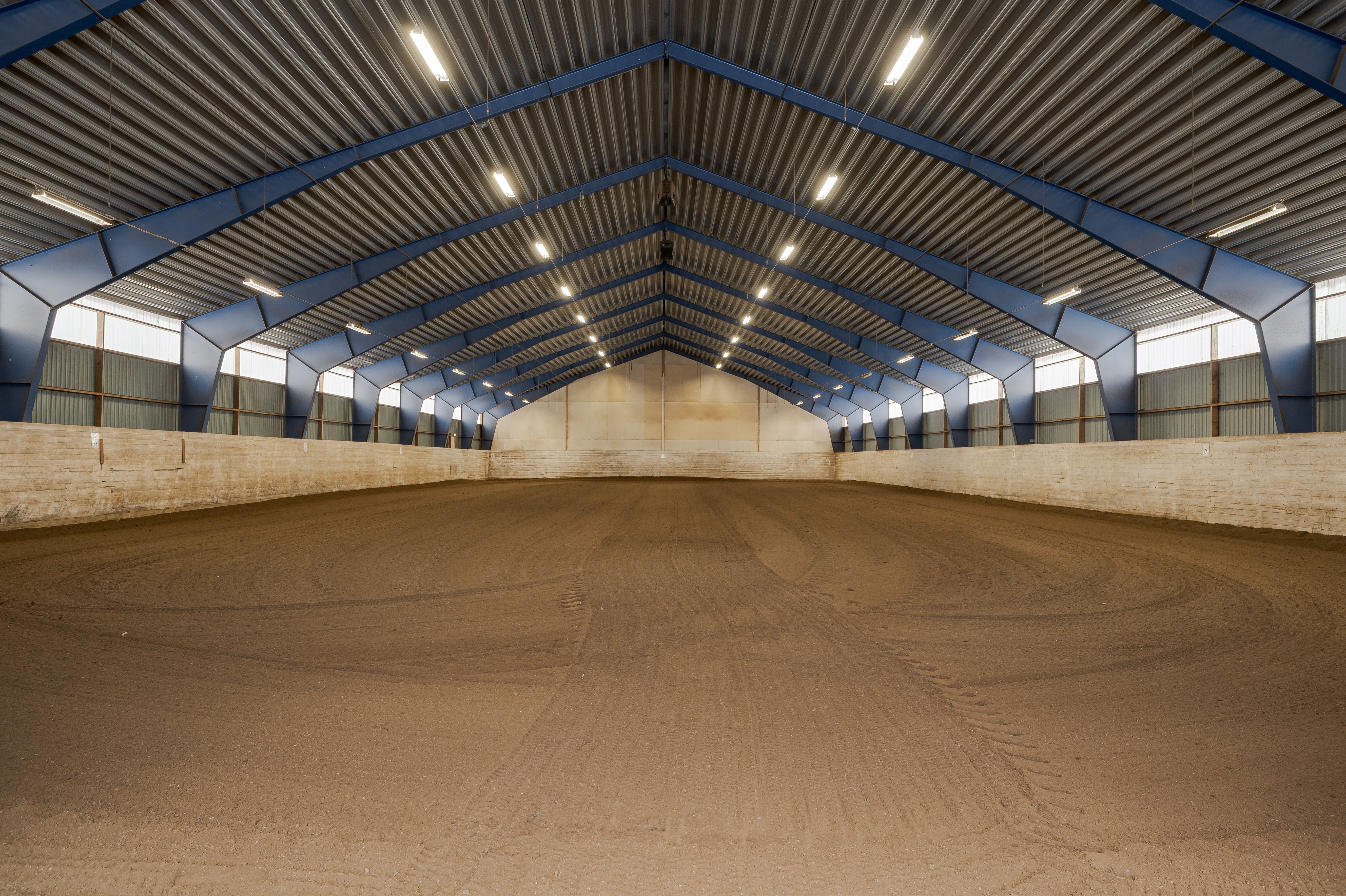 Gamla ridhuset: Byggt 1987. Betongplintar och stålstomme och isolerat tak med plåttak. Uppvärmd lokal om ca 30 kvm (direktel) samt luft/luft. Under läktaren finns ett hinderförråd med bevattningsanläggning för båda ridhusen. Måtten är ca 66 x 22 m (ridytan är 60x22). Passar både hoppning och dressyr. På ridbanan ligger Heidelberg materiels ridbanesand (inlagd för tre år sedan) blandat med flis.