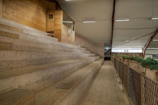 Interiör: Två uppvärmda kontor (direktel), personalkök av enklare karaktär (det finns en diskbänk och vatten är indraget). Här finns även en kundtoalett, Peronaldusch och wc samt förvaring och tvättmaskin (Wascator). Trappa upp till övervåningen med förvaring för klubbens medlemmar samt ett fikarum för gårdens personal. Uppe finns även ett förråd. Allt uppe är uppvärmt (direktel). På övervåningen finns en dörr som leder till den stora höskullen med plats för förvaring och 2 torkfläktar (inte använt sedan 1998).