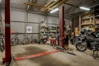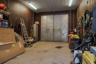 Verkstaden är byggd på gjuten platta, med stålstomme och plåttak. En uppvärmd del som värms med luft/luft finns där man med fördel mekar. Den andra delen (2/3 av ytan) är maskinhall med två skjutportar. Utrymmet är oisolerat idag men går att isolera. Här finns en tvåpelarlyft (till bilar).