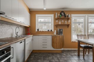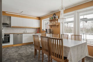 Kök från 2004 med klinkergolv med vattenburna slingor, rostfria vitvaror, dubbel kyl och frys (2024), diskmaskin (ca 15 år), ugn (2023) spis med häll (2023), spisfläkt med fläktmotor såväl vid kåpan liksom uppe på taket.