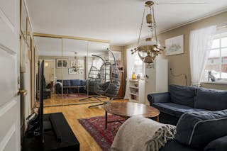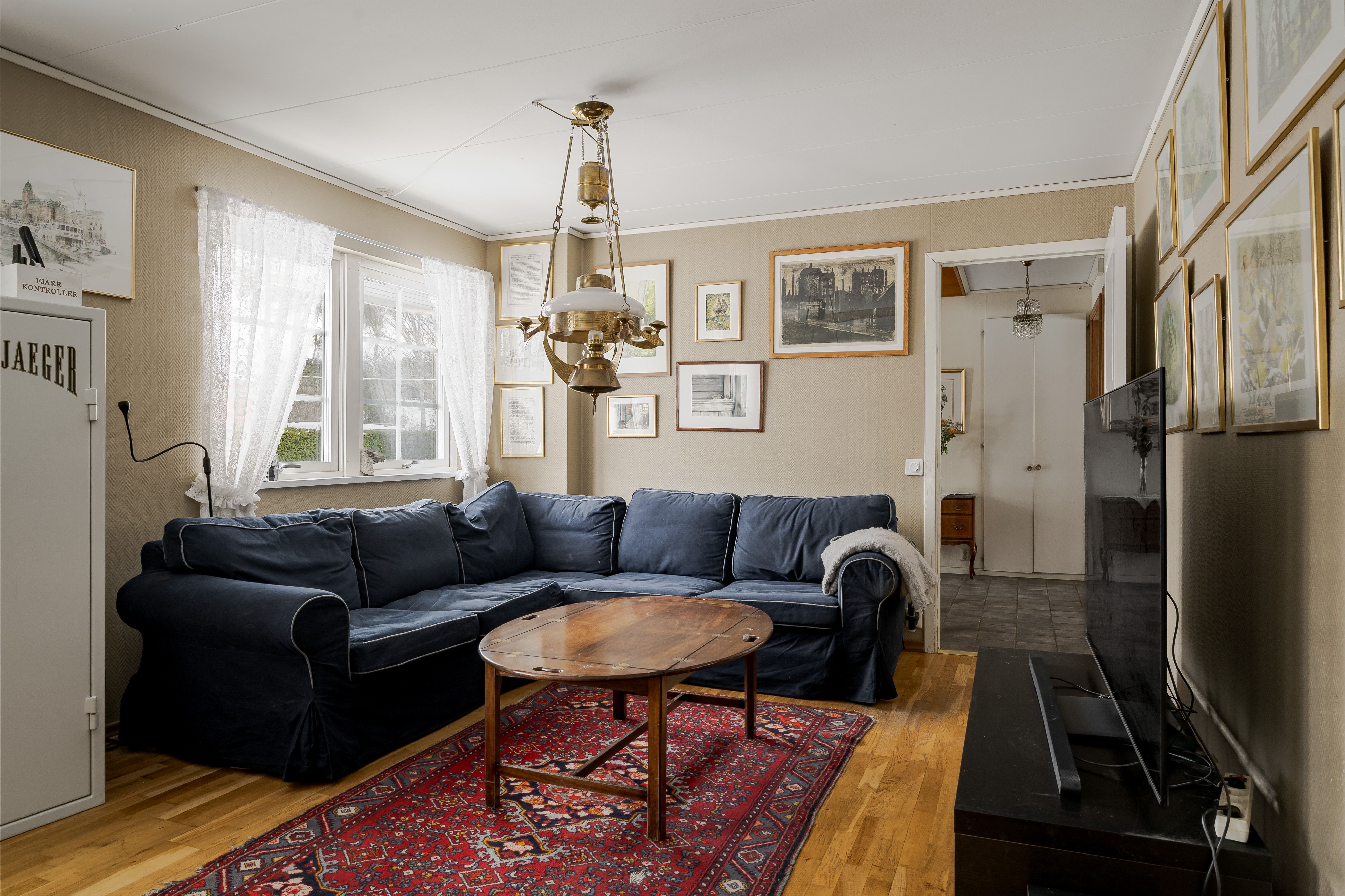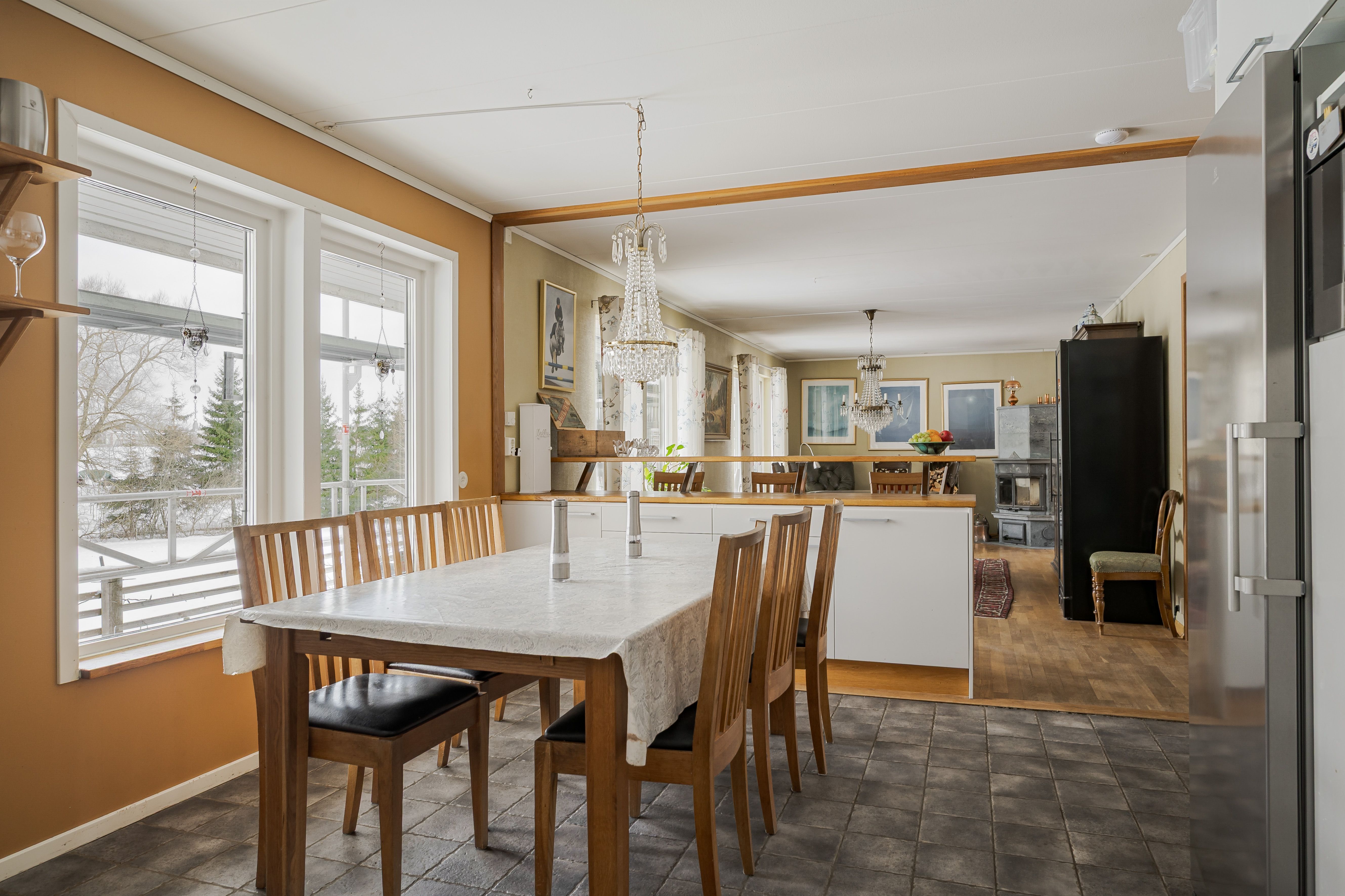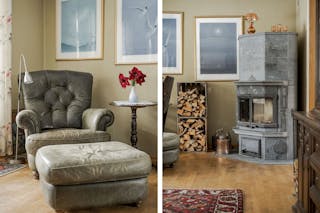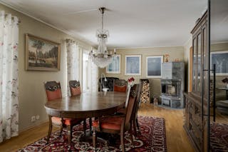 Vardagsrum med ekparkett, tulikivi täljstens-kakelung, målad väv och utgång till baksidan med altan och utsikt över egna ägor.