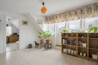 Övre plan: Hall/allrum med plastmatta, takkupa och utgång till balkong.