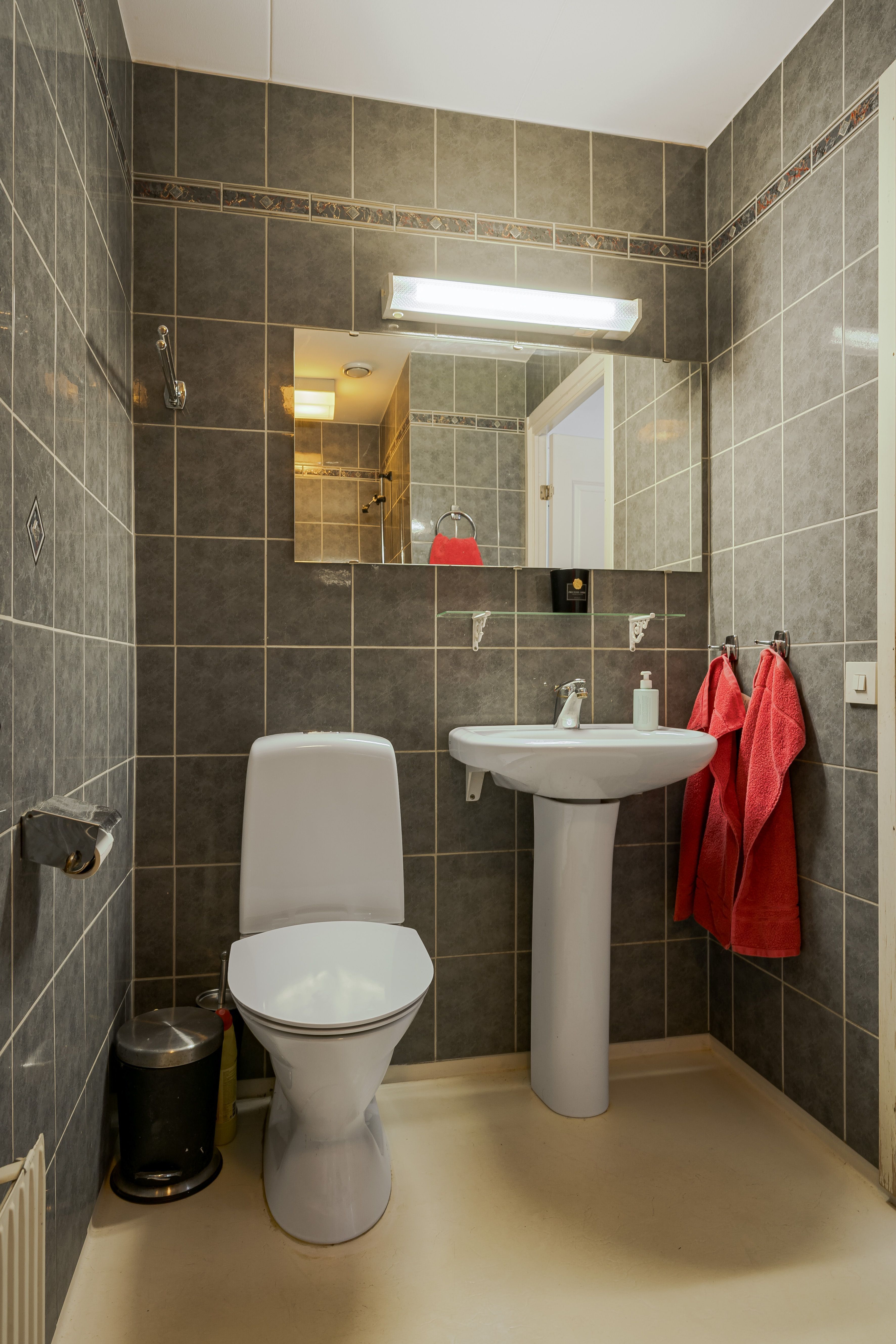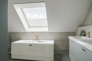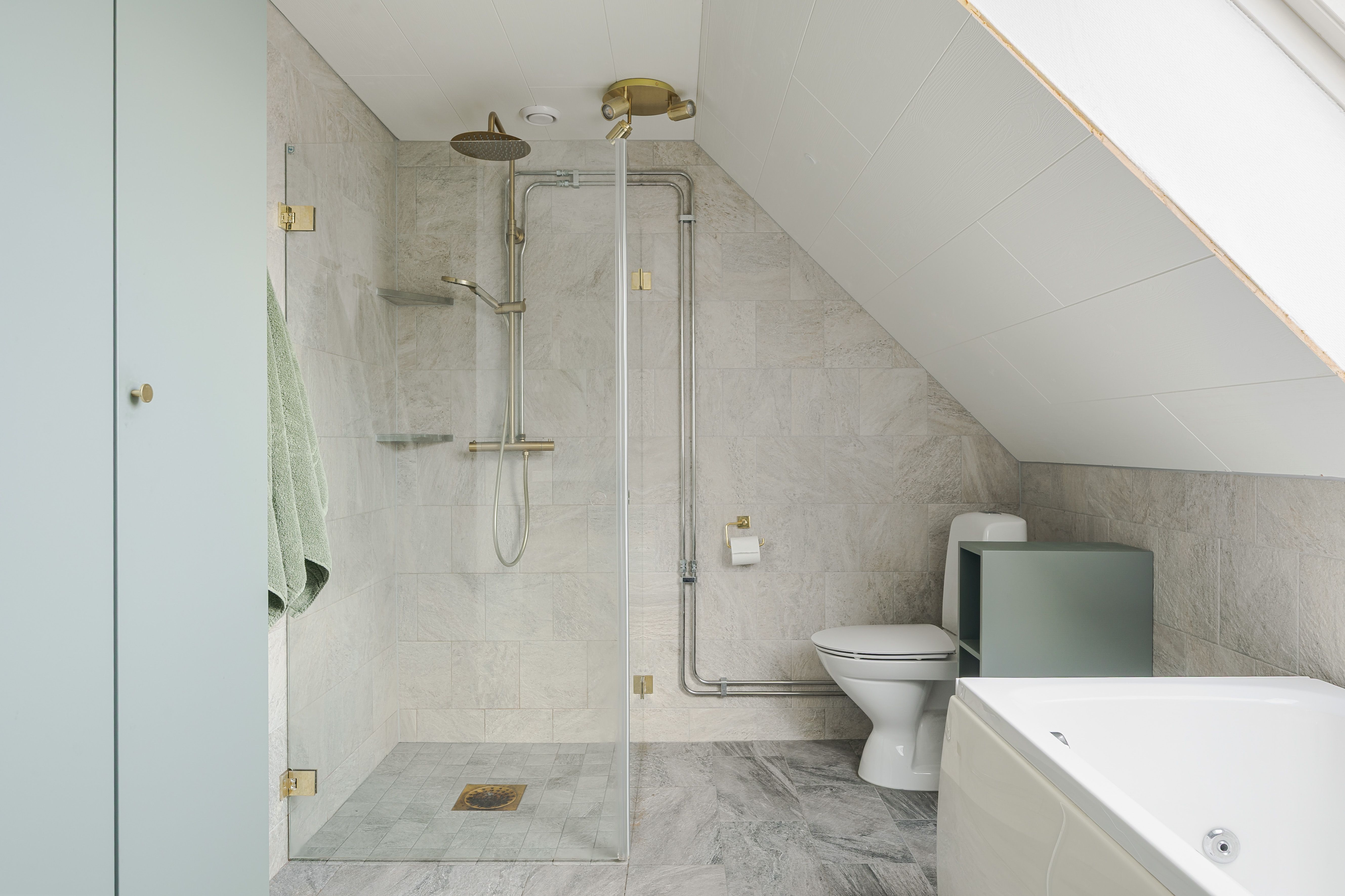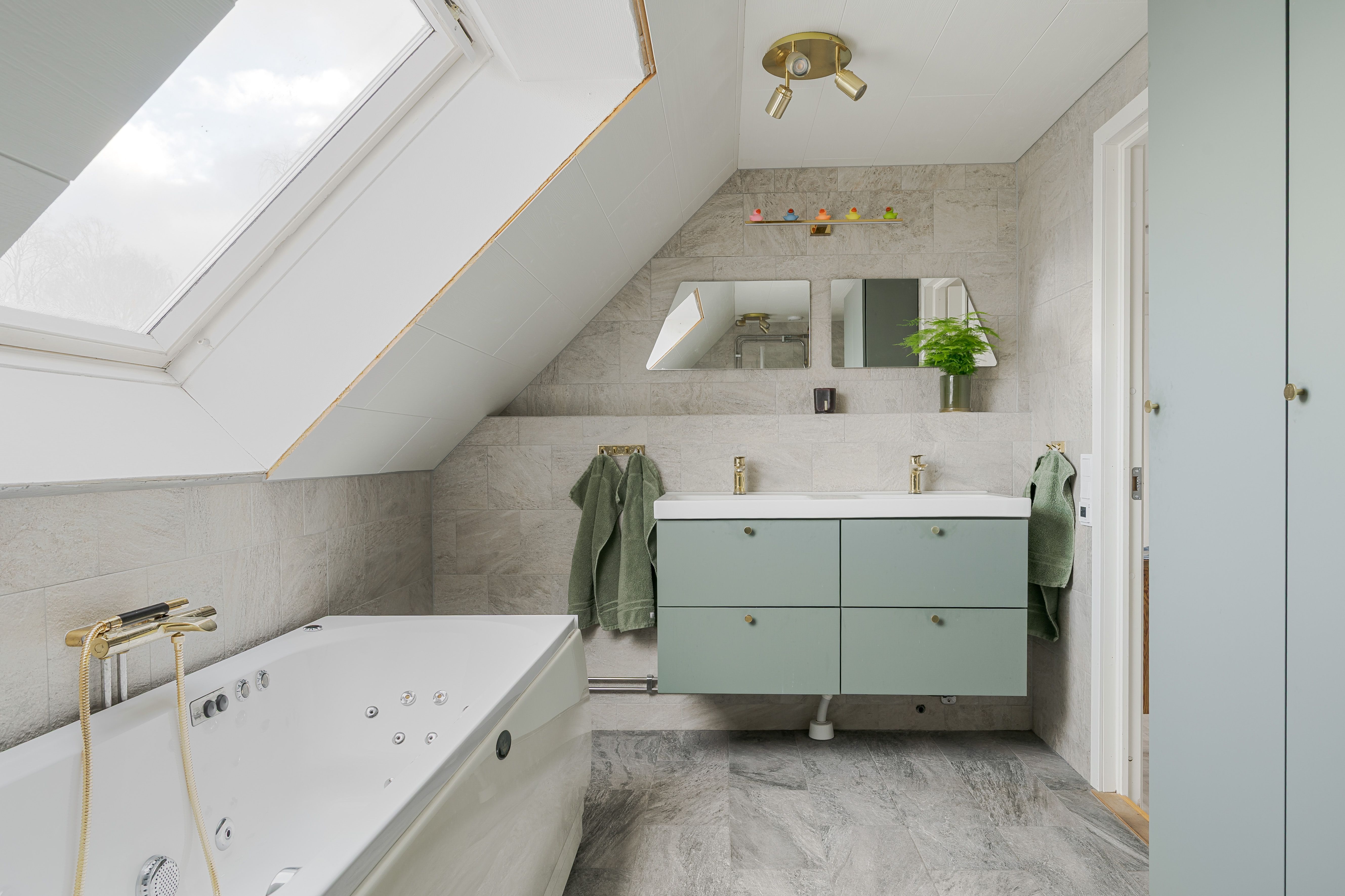 Badrum renoverat 2021. Utrustat med klinkergolv med elslingor, kaklade väggar, glasduschväggar, bubbelbadkar, dubbelt handfat och wc samt takfönster.