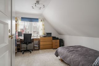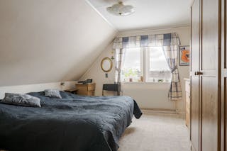 På övre planet finns en hall samt två sovrum varav det ena är ett nyrenoverat stort rum med klickgolv. Båda sovrummen har nya 3-glasfönster och utrymmen på kattvinden.