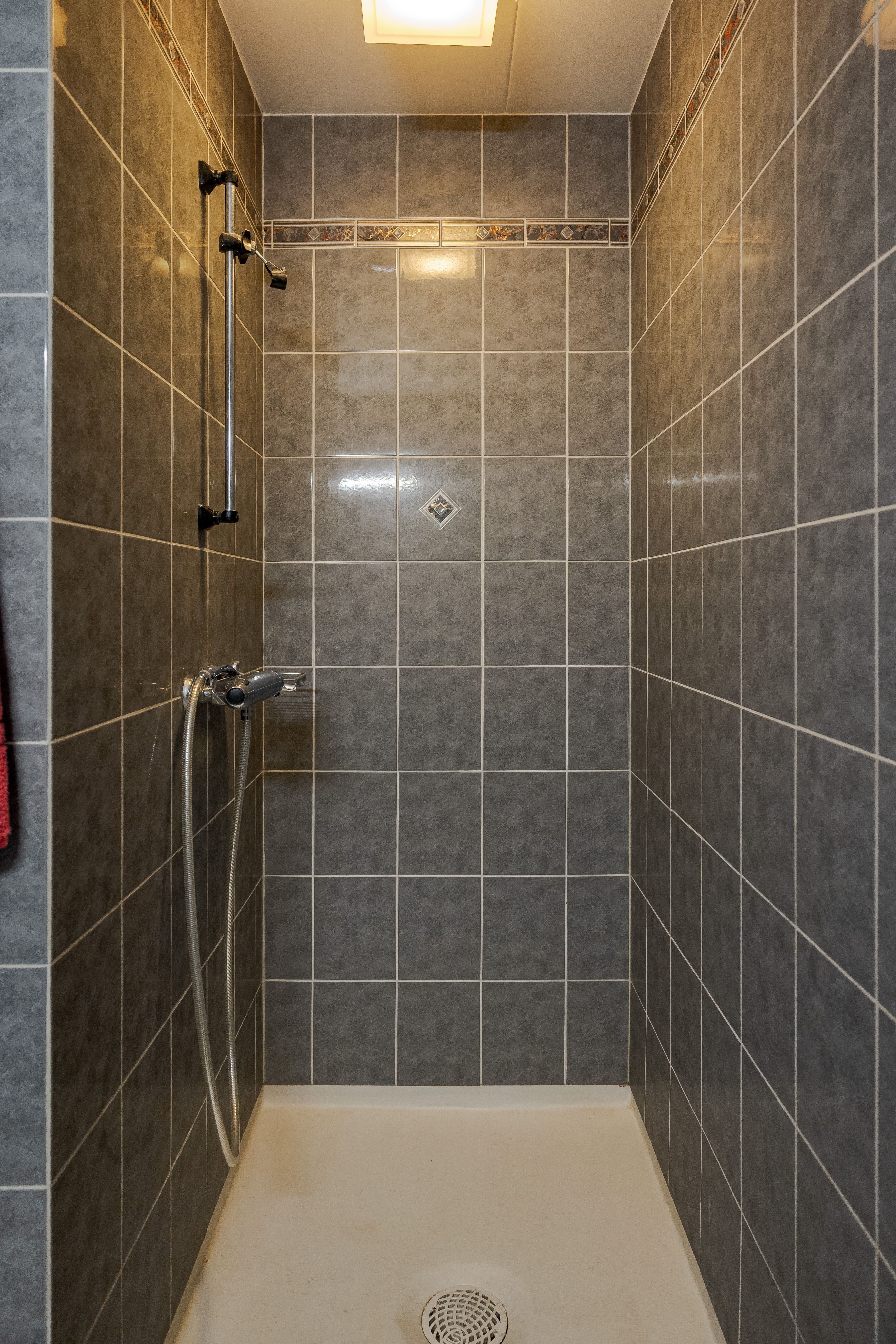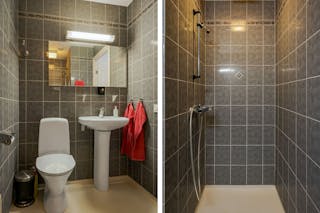 Duschrum med plastmatta, kakel, wc och duschhörna. Renoverades 1991.