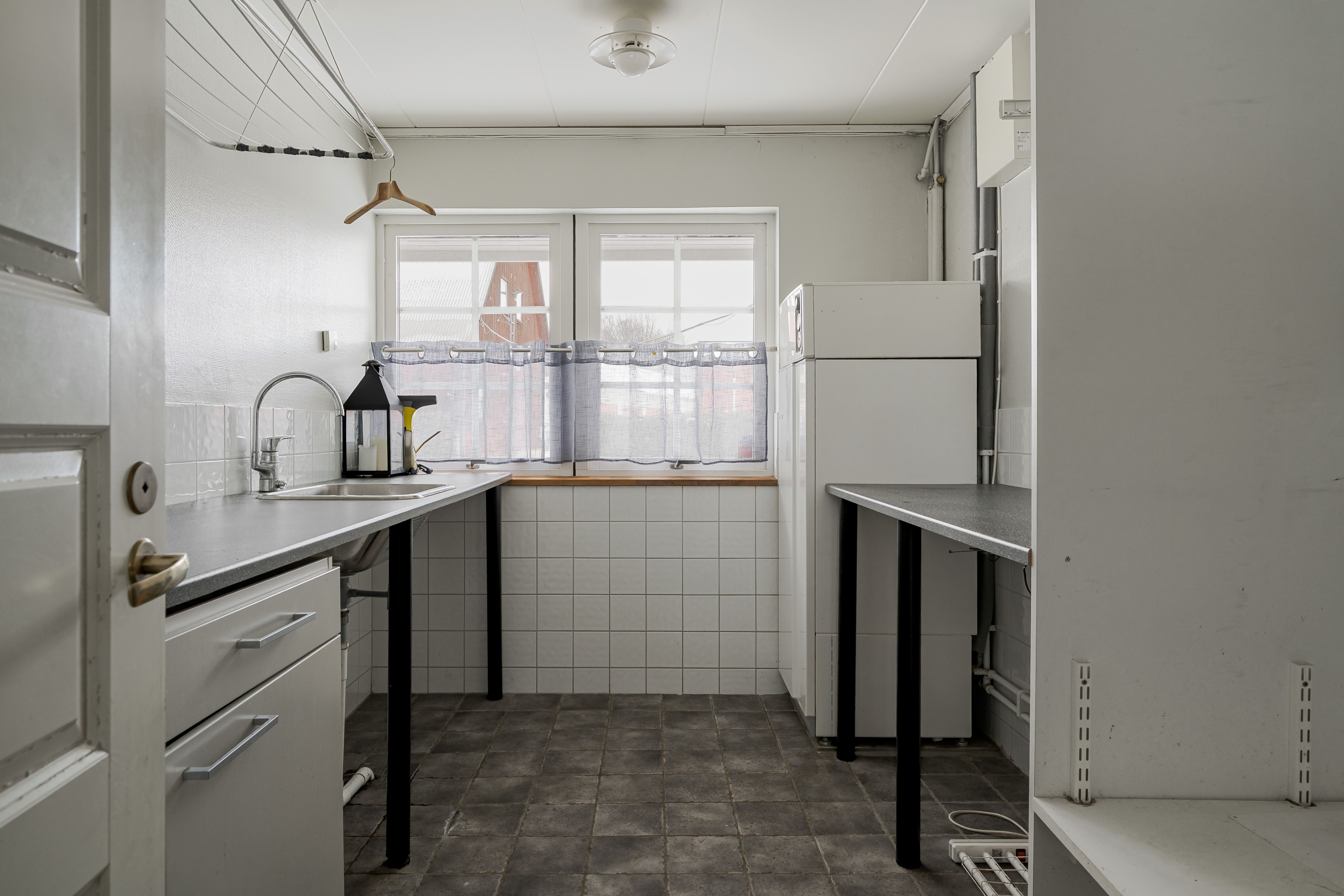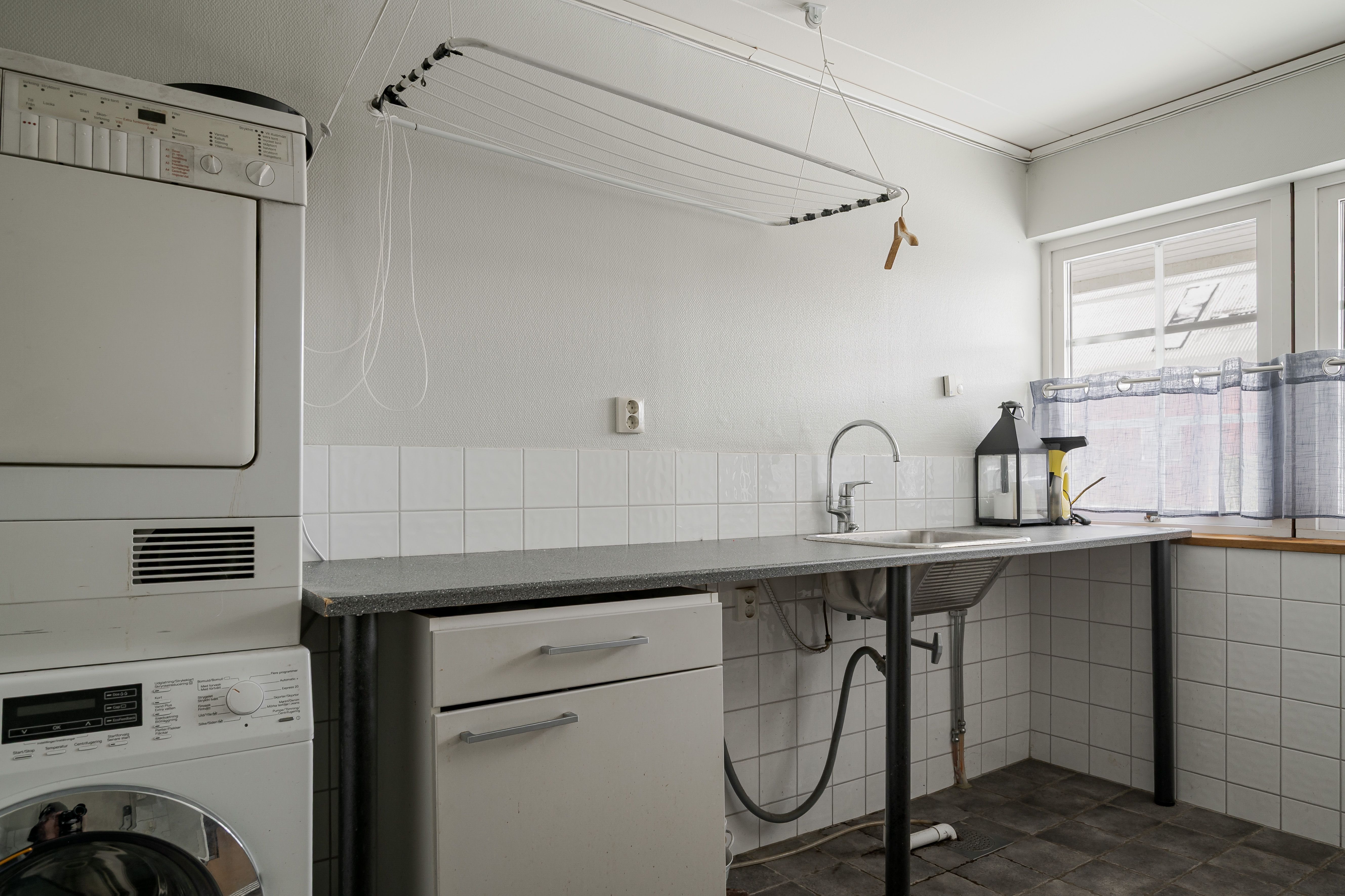 Tvättstuga med klinkergolv och vattenburna värmeslingar, Miele tvättmaskin (2018), torktumlare (äldre), grovtvättställ, varmvattenberedare (Nibe) som endast värmer tappvarmvattnet. Här finns även ovan nämnda elpanna som värmer vattnet till värmesystemet.