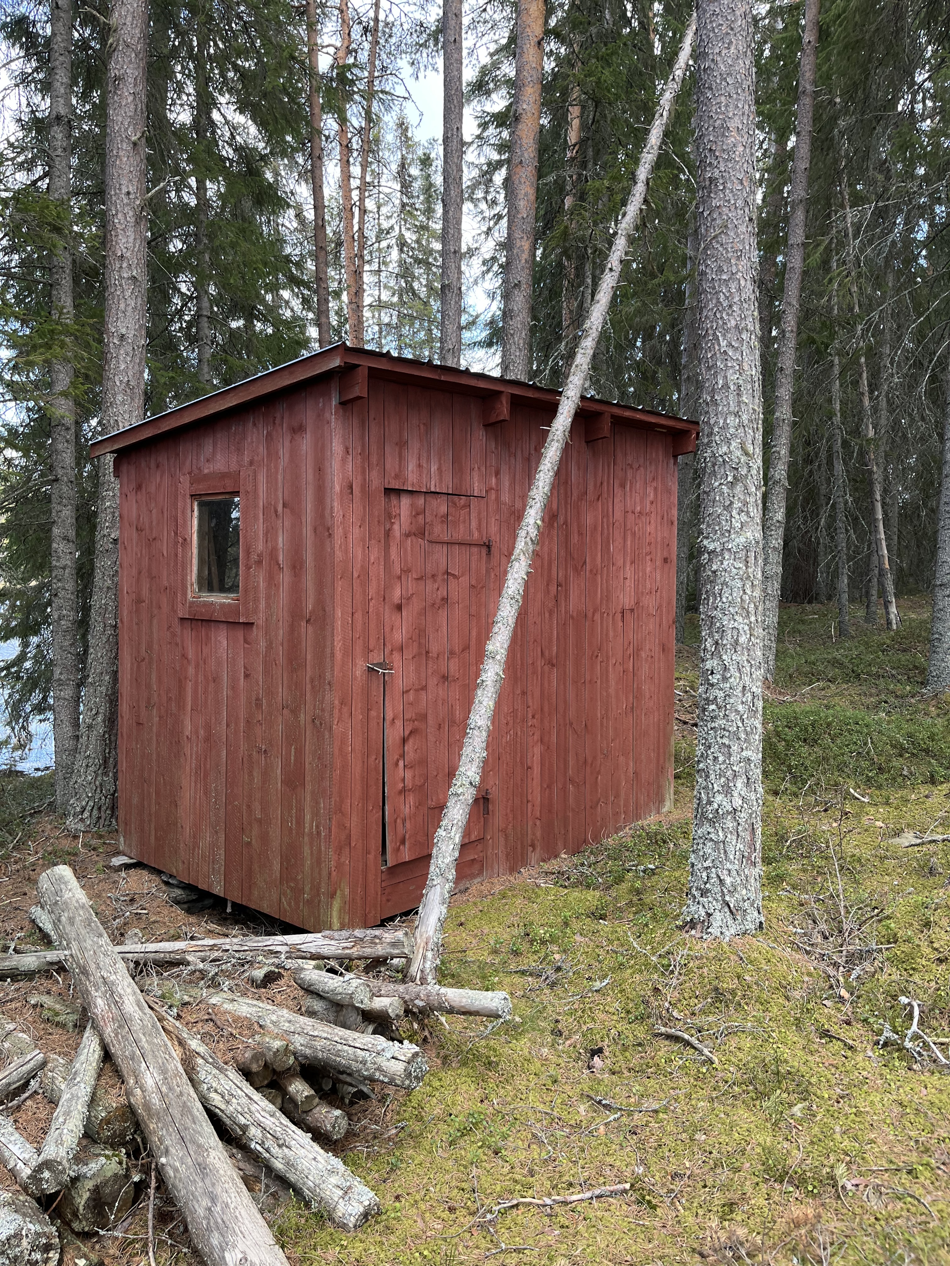 Loge uppförd i timmer med påbyggnad i stående träpanel under plåttak. Byggnaden är i två plan och används i huvudsak som förvaringsutrymme.