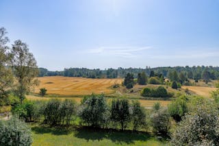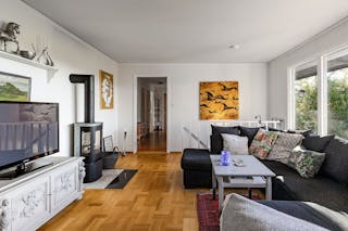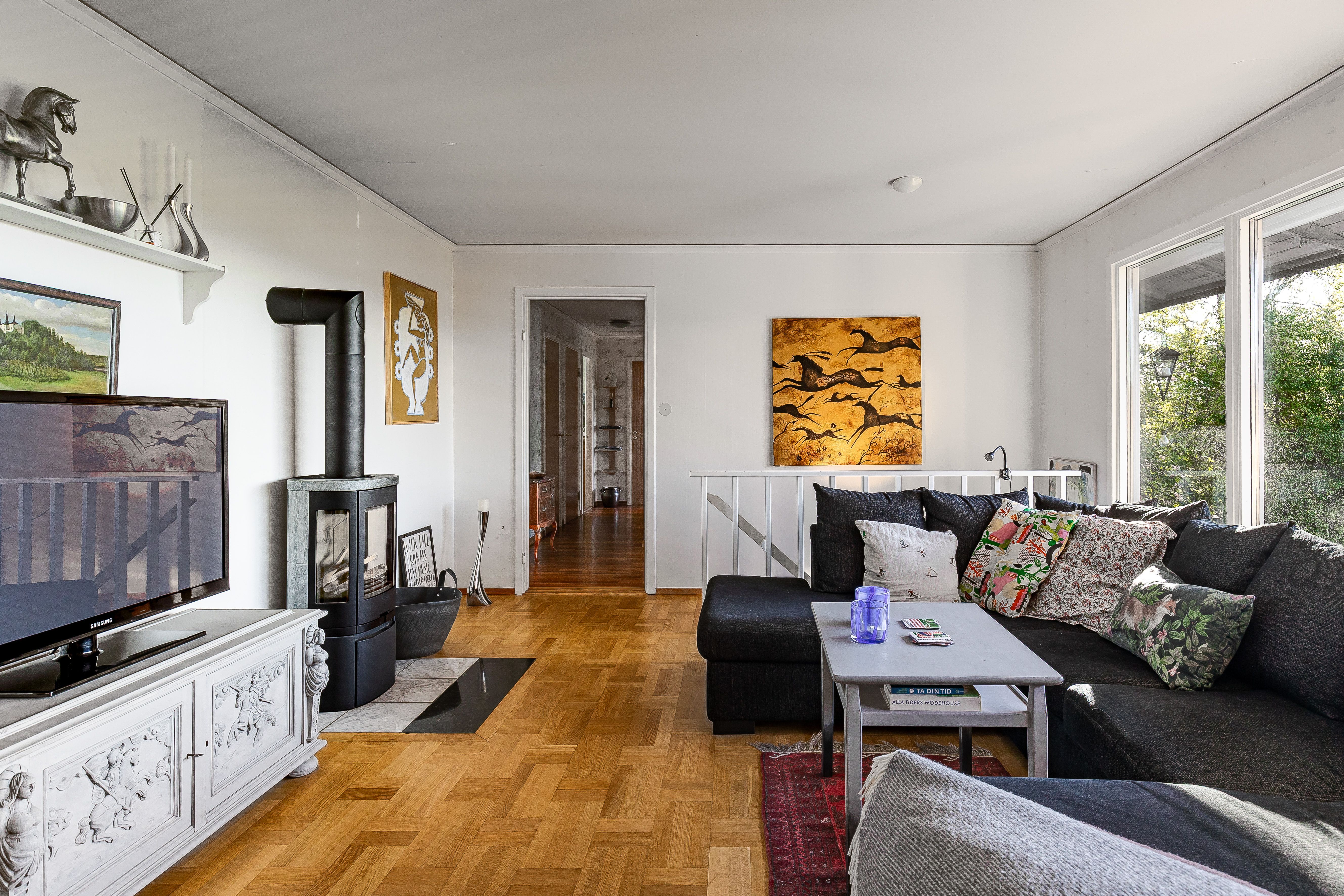 Vardagsrummet är en förlängning av kök och matplats och en naturlig del för umgänge. Tänd en brasa i täljstenskaminen (2012), bjud på ett glas gott och njut av den fantastiska utsikten över åker och skog.