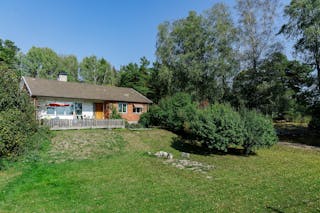 Denna villa ligger i vackert söderläge med en trevlig utsikt över åkrar och skog. Byggnaden är uppförd 1964 och omfattar 6 rum varav tre-fyra är sovrum. Därtill finns tre badrum, tvättstuga och verkstad i källarplan. Planlösningen är mycket trevlig och villan ger ett öppet och ljust intryck genom de stora fönsterna.