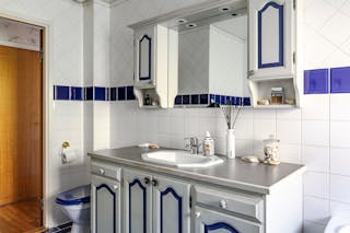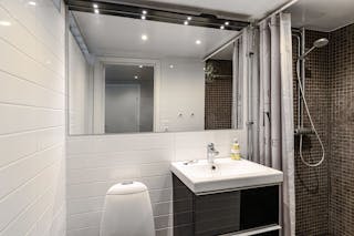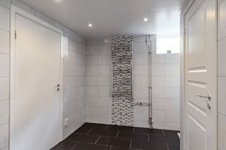 Det finns även ett modernt och renoverat utrymme med kaklade väggar och klinker på golv med ett separat badrum med wc och dusch.