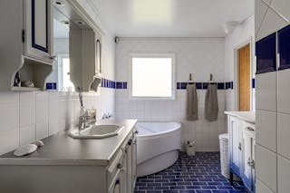 Luftigt badrum med generösa ytor. Här finns badkar, tvättställ och toalett. Helkaklade väggar och klinkergolv med golvvärme.