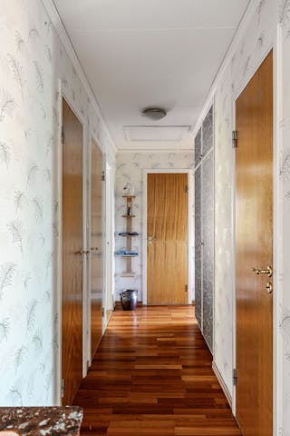 Bostaden har löpande underhållits och är i gott skick. På entréplan är det genomgående parkettgolv och målade eller tapetserade väggar.