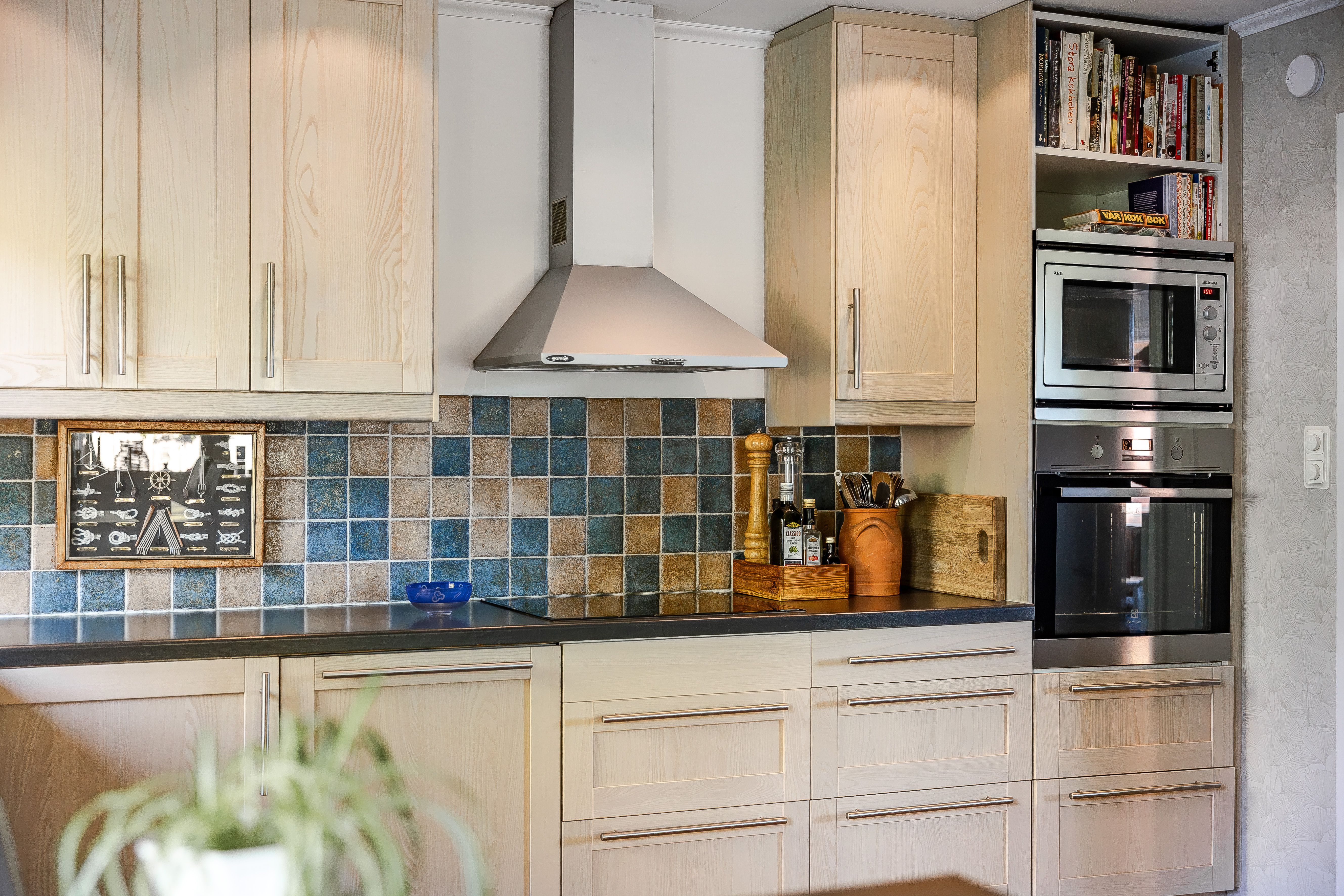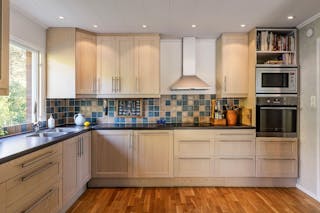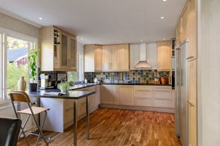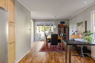 Välskött och stort kök i öppen planlösning med matplatsen och gott om ljusinsläpp. Köksinredning i ljus ek med bra förvaringsmöjligheter och stora arbetsytor. Vitvarorna är i rostfritt stål samt en integrerad diskmaskin. Här finns utrymme för ett stort matbord som bjuder in till trevliga middagsbjudningar. Varför inte avsluta aftonen i det inglasade uterummet eller vid poolområdet, en mild sommarkväll.