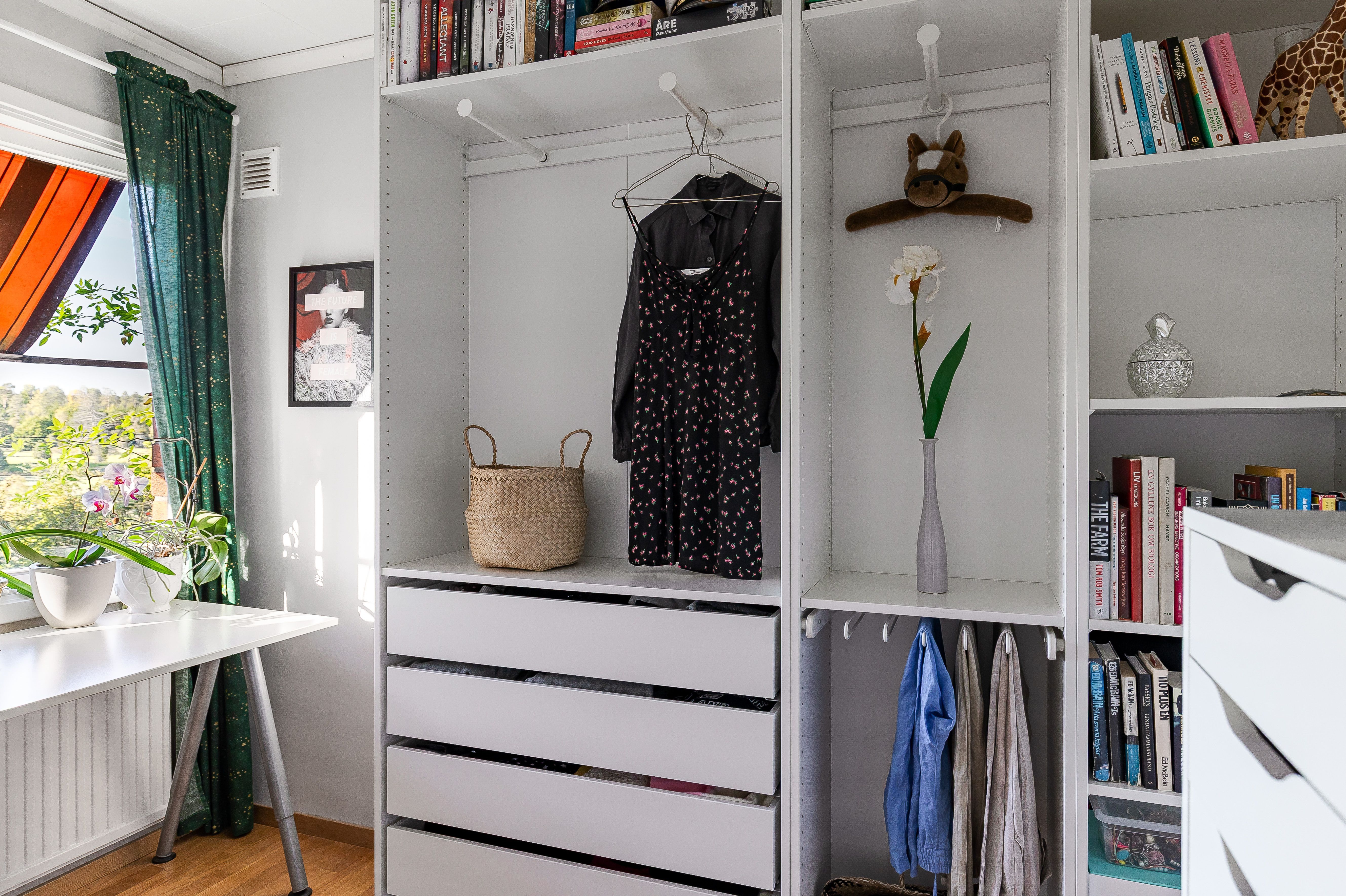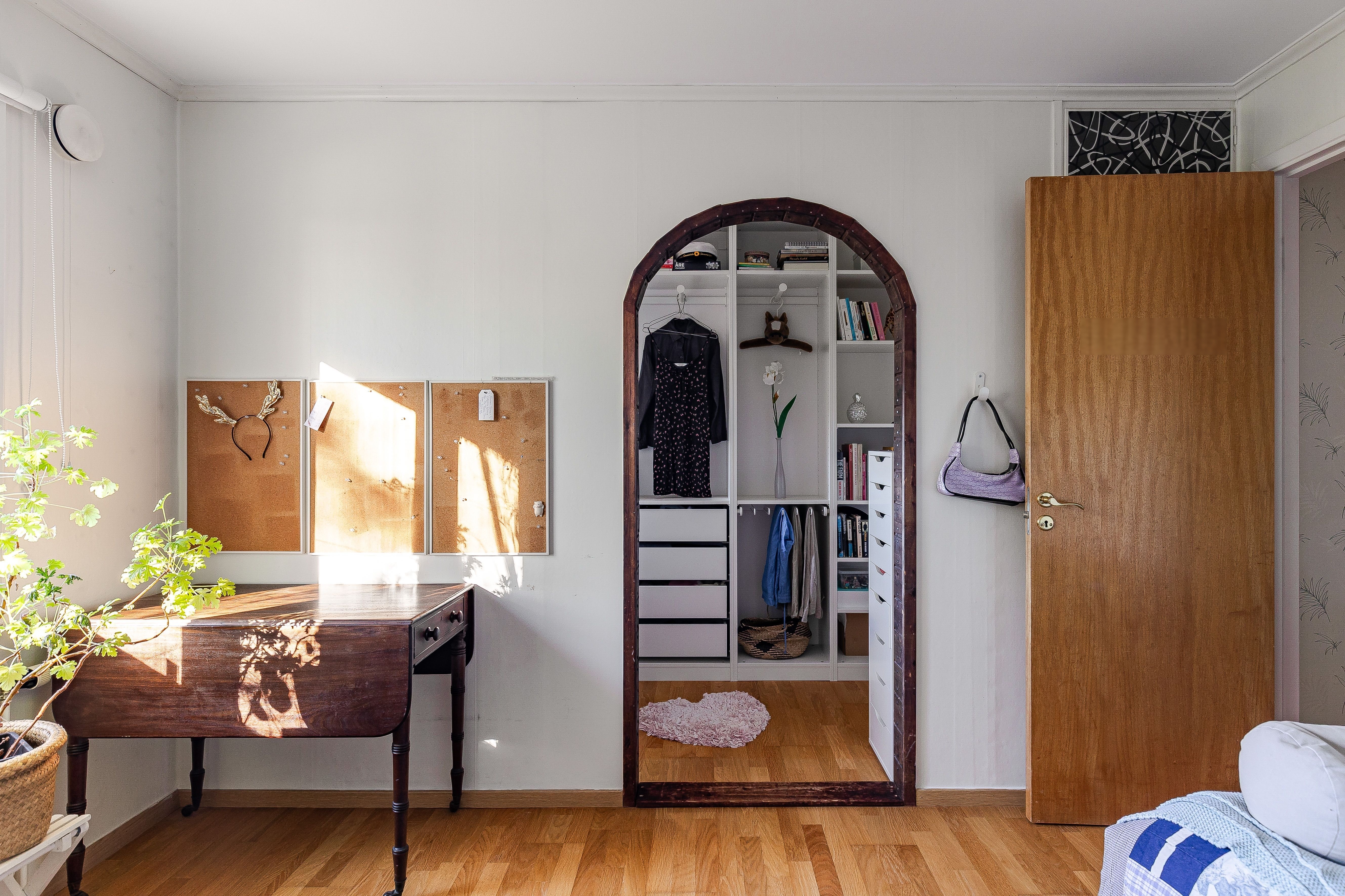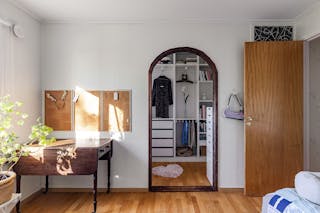 Väggen mellan denna walk in-closet och klädkammaren i hallen är monterad mellan innertaket och innergolv varpå den är enkel att ta bort om ett extra sovrum önskas.