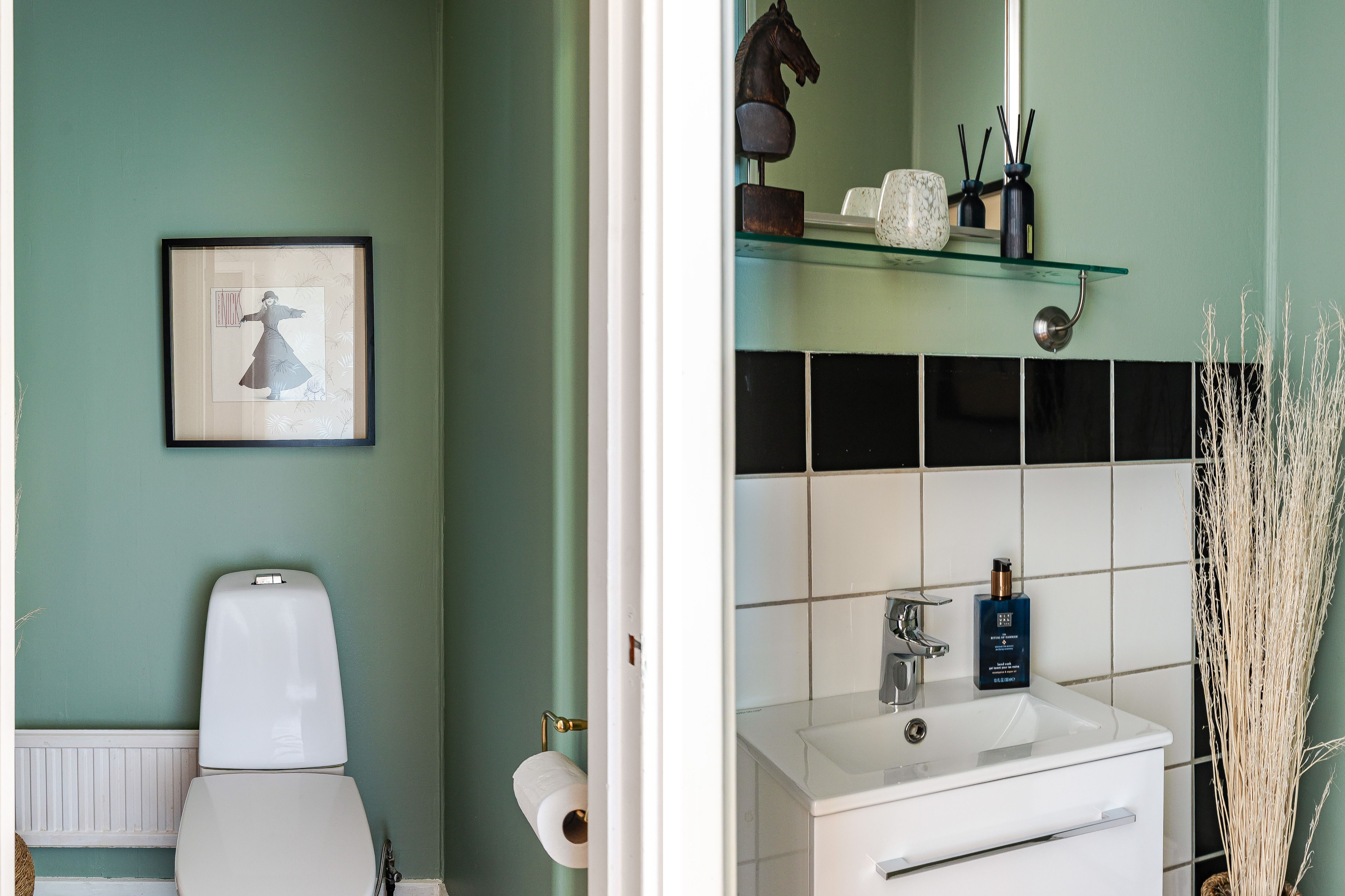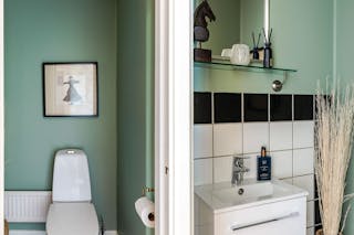 Gäst-WC med toalett och tvättställ samt vägghängd kommod med förvaringsutrymmen.