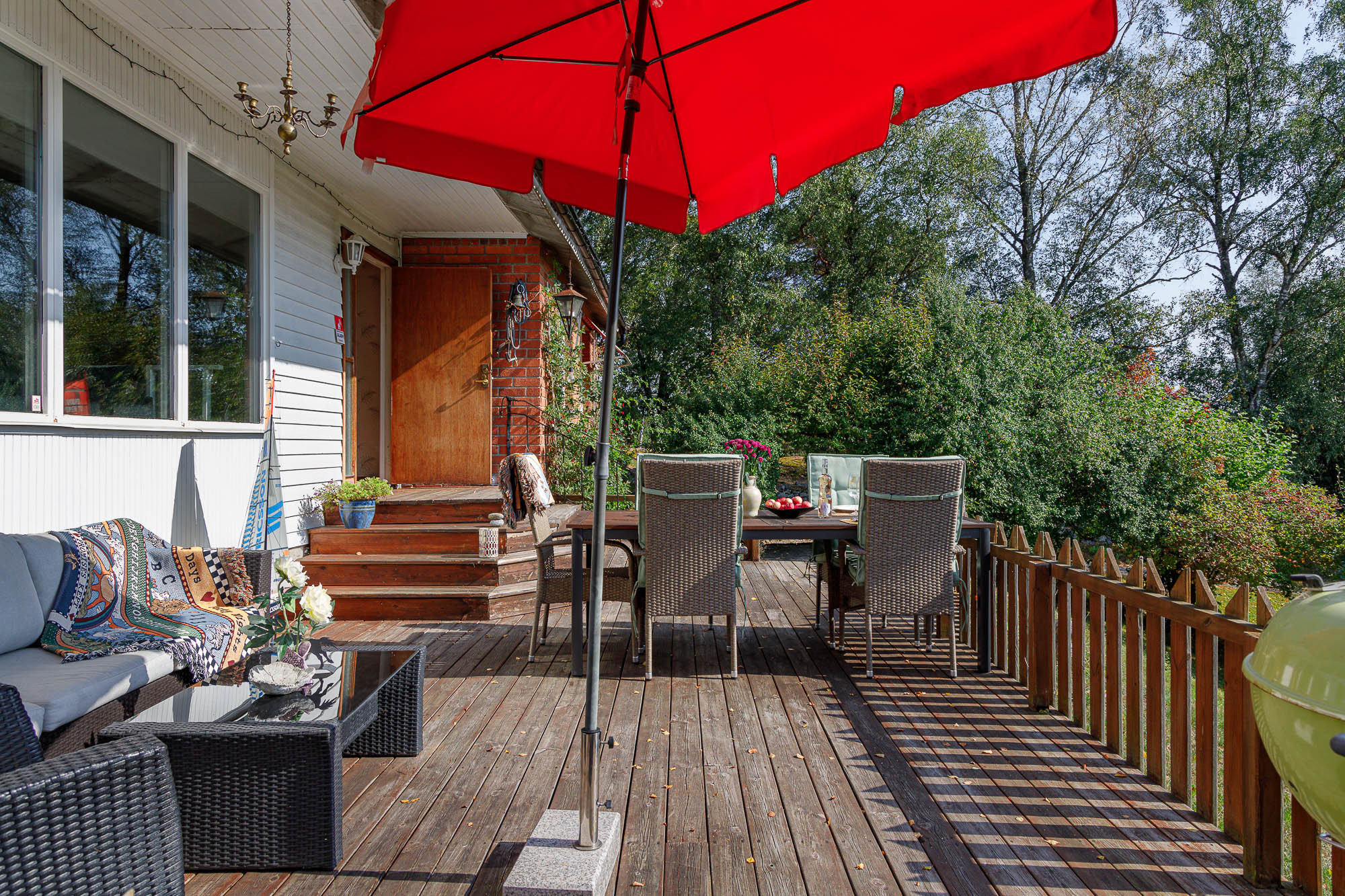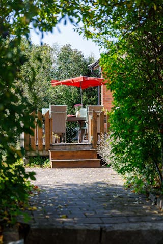 Stor och uppvuxen trädgård med syrenbuskar, fruktträd och allehanda blommor. Stora ytor som lämpar sig för mindre rasthagar, odling eller lek och spring i benen. Marken är till vissa delar gräsbevuxen och andra delar naturtomt.