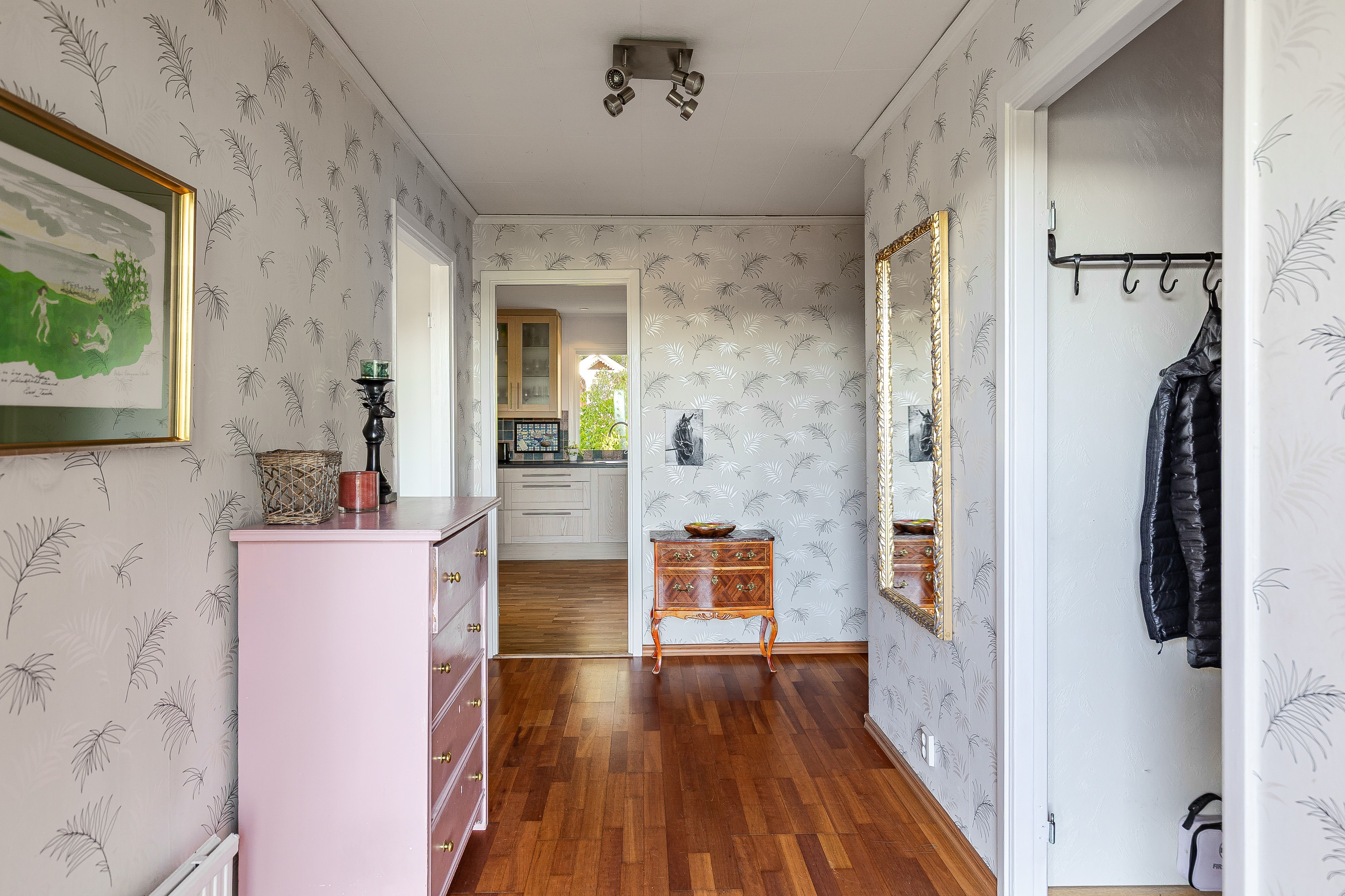 Rymlig hall med goda förvaringsmöjligheter i den intilliggande klädkammaren.
