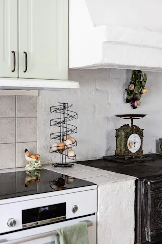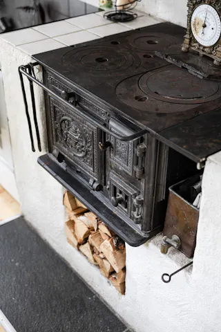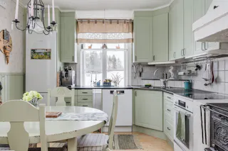 Köket är utrustat med inmurad vedspis med murad kåpa, spis, fläkt diskmaskin och kombinerad kyl/frys.
