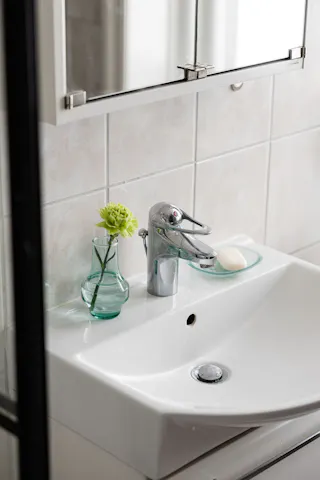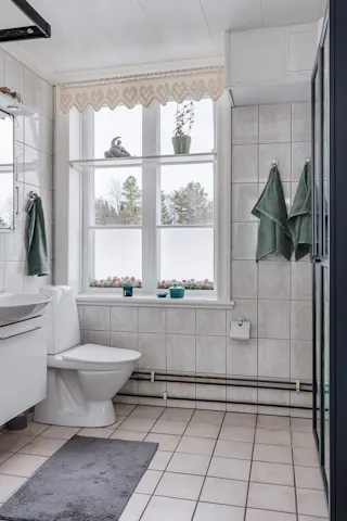 Badrum utrustat med golvvärme, dusch, wc och handfat med kommod.