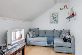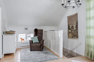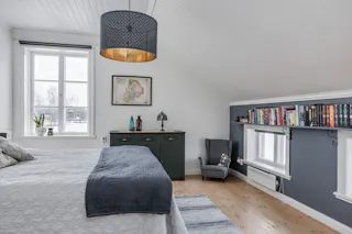 Övre plan med vardagsrum/allrum, klädkammare, stort sovrum samt ett mindre sovrum/kontor.