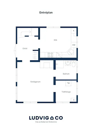 Entréplan med hall, kök, vardagsrum samt badrum och tvättstuga.