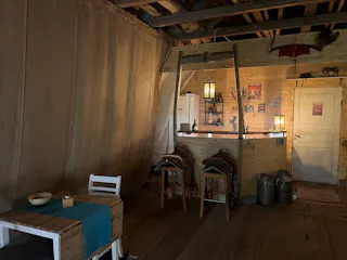 Övre plan utgörs av en tidigare loge som idag används som enklare festlokal. I anslutning finns även en isolerad del som med fördel kan användas som gästrum, med uppvärmning via vedkamin samt element.