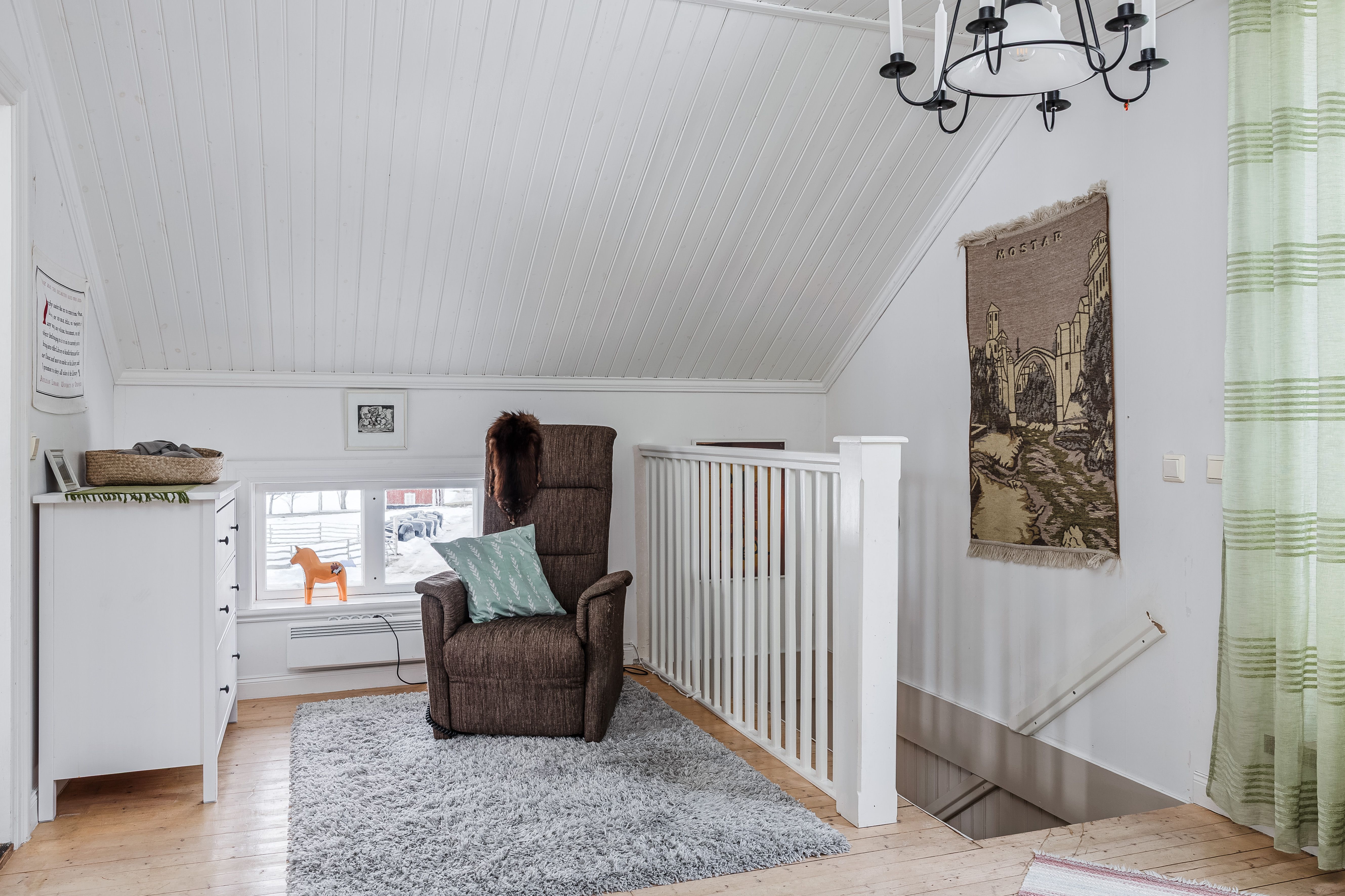 På övre plan finns ett allrum, två sovrum, varav ett mindre som även kan användas som kontor, samt klädkammare. Här finns trägolv och pärlspont i tak.