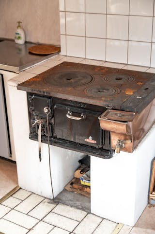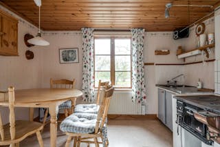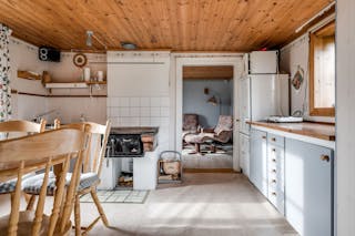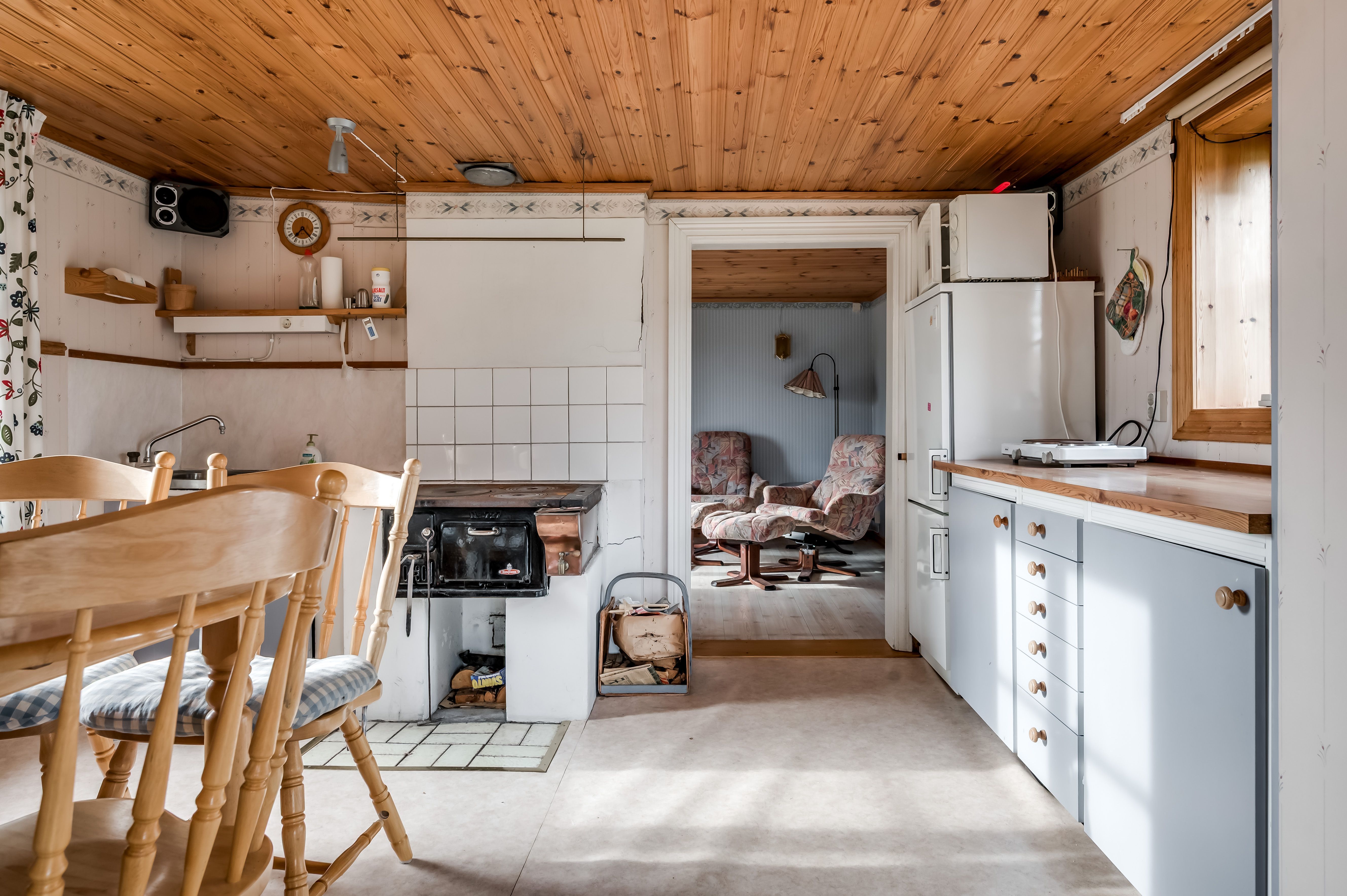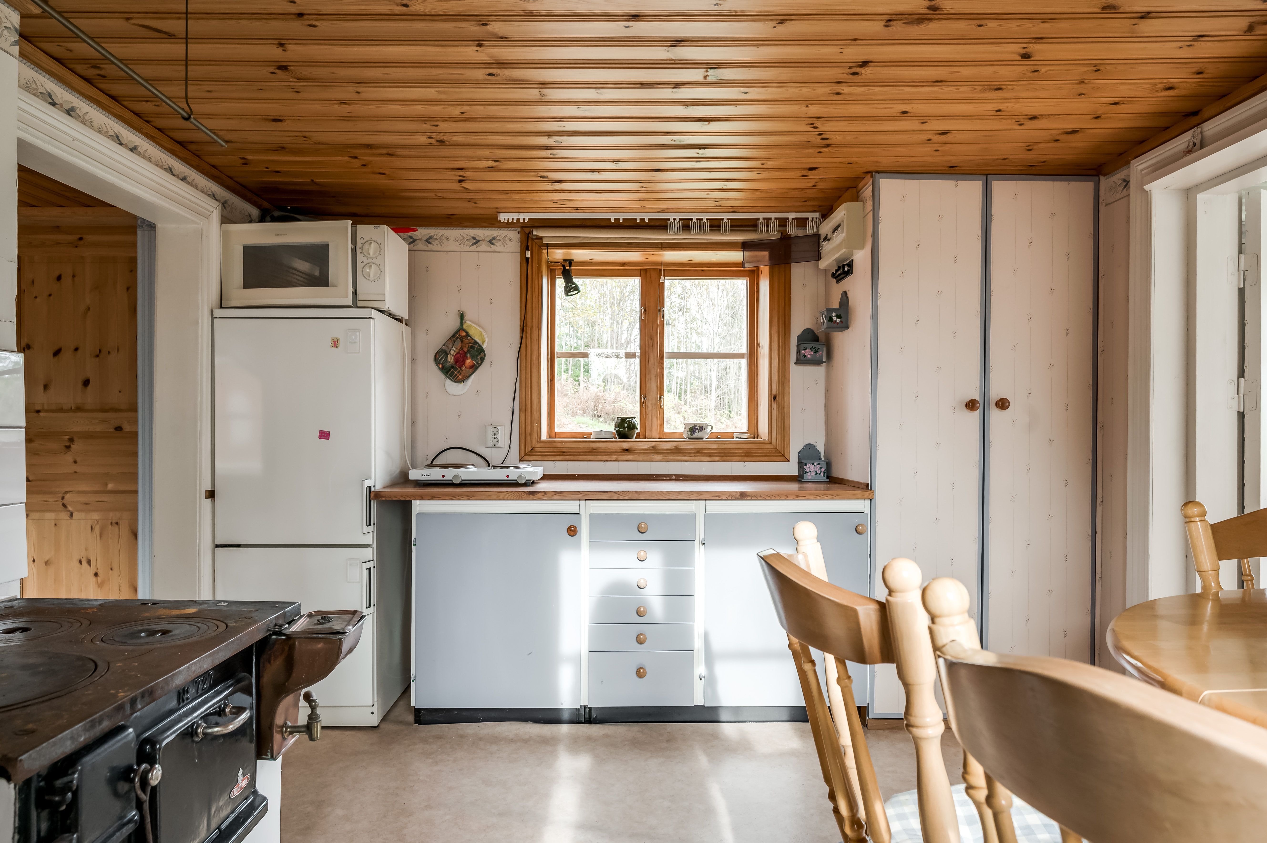 Kök med enklare standard utrustat med kyl-/frysskåp, mikrovågsugn samt vedspis som bör kontrolleras.