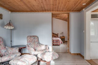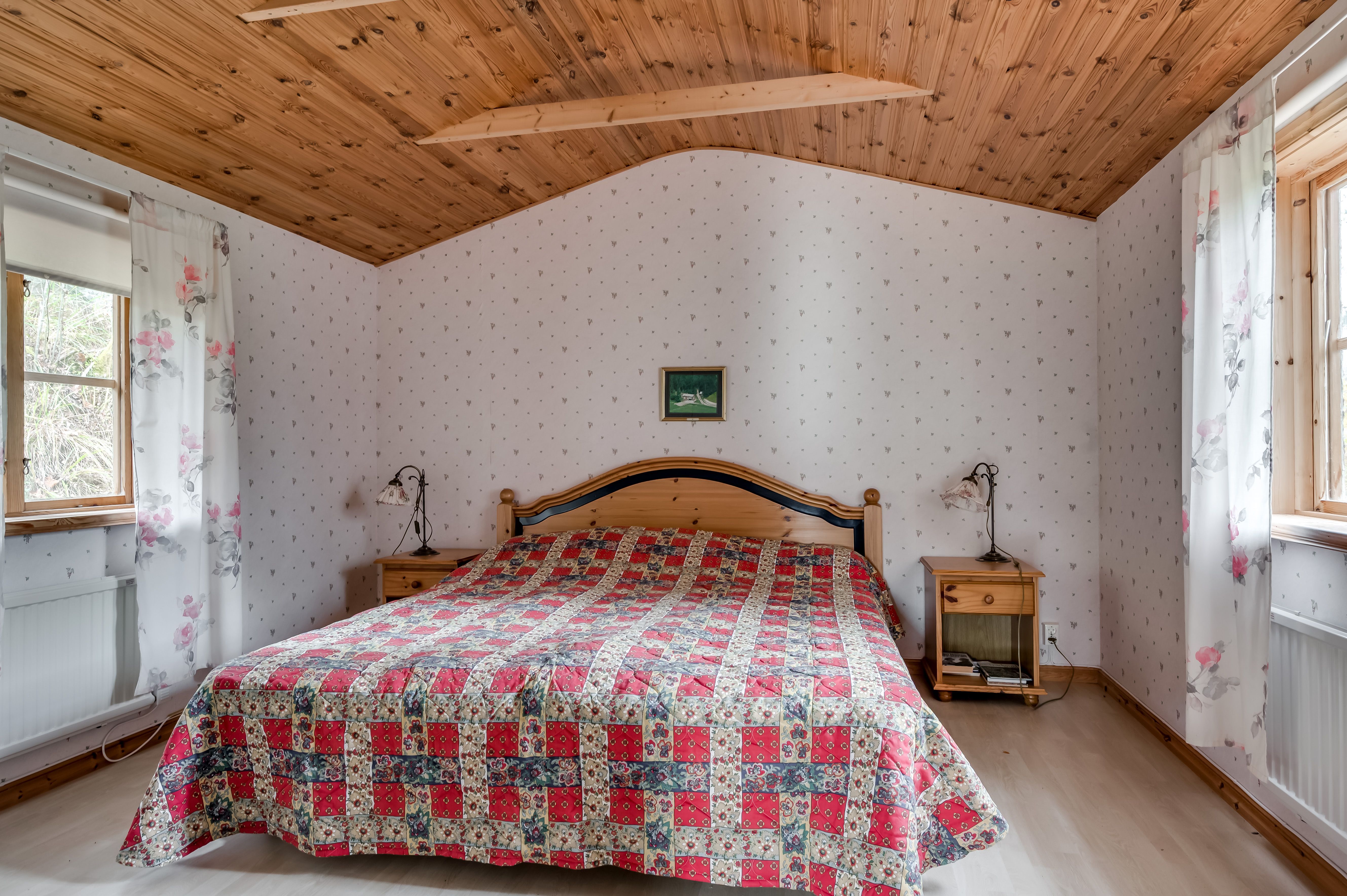 Sovrum med ryggåstak som ger rymd och karaktär åt rummet.
