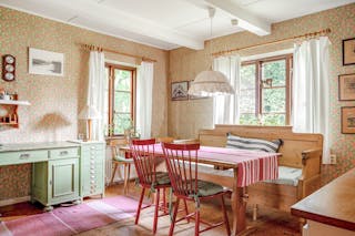 Intill köket ligger en separat matsalsdel som rymmer större matbord. Plastmatta och tapetserade väggar.