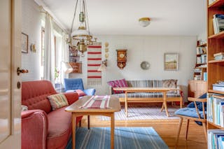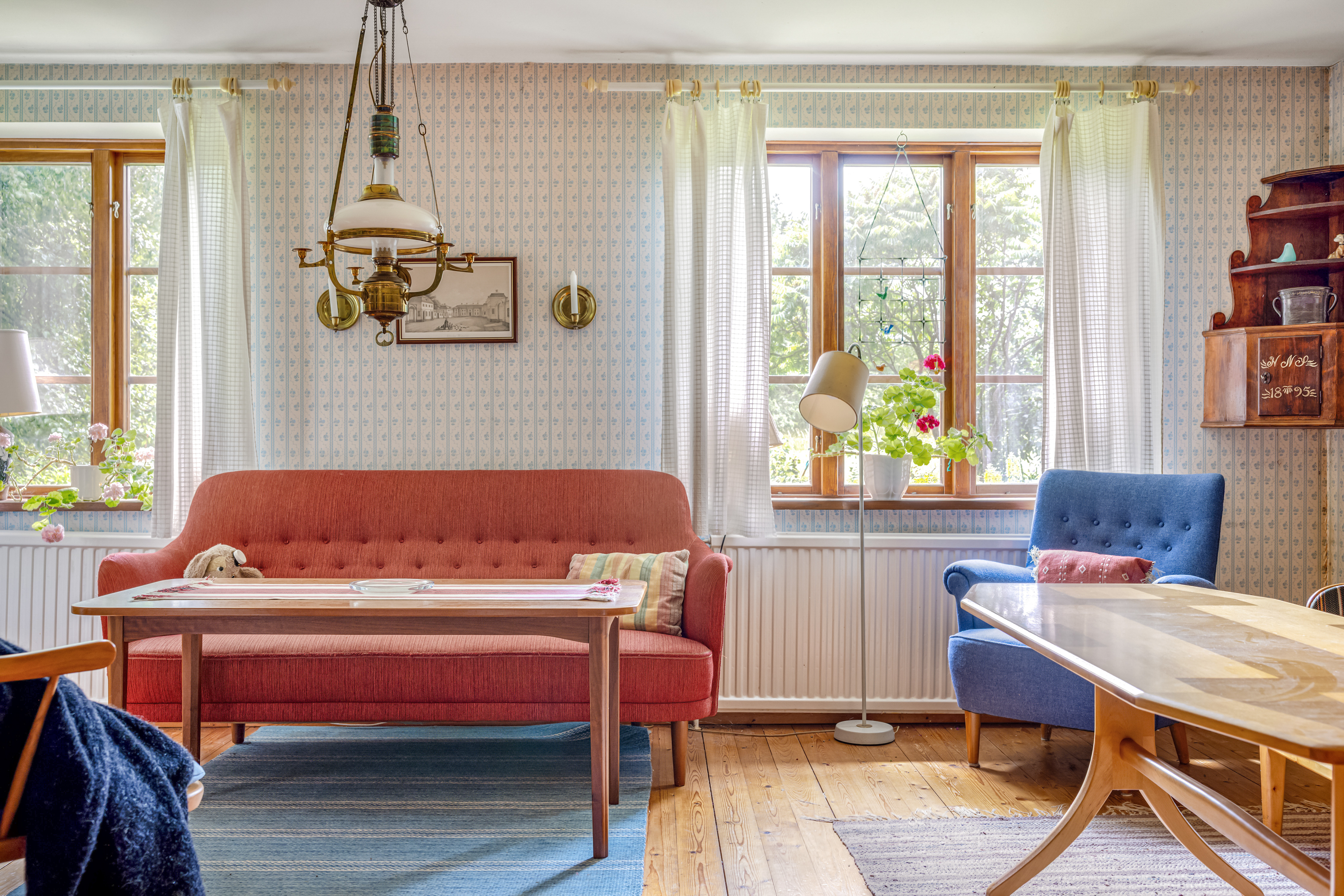 Vardagsrummet är ljust och trivsamt med fönster mot trädgården och gott om plats för både soffgrupp och läshörna.