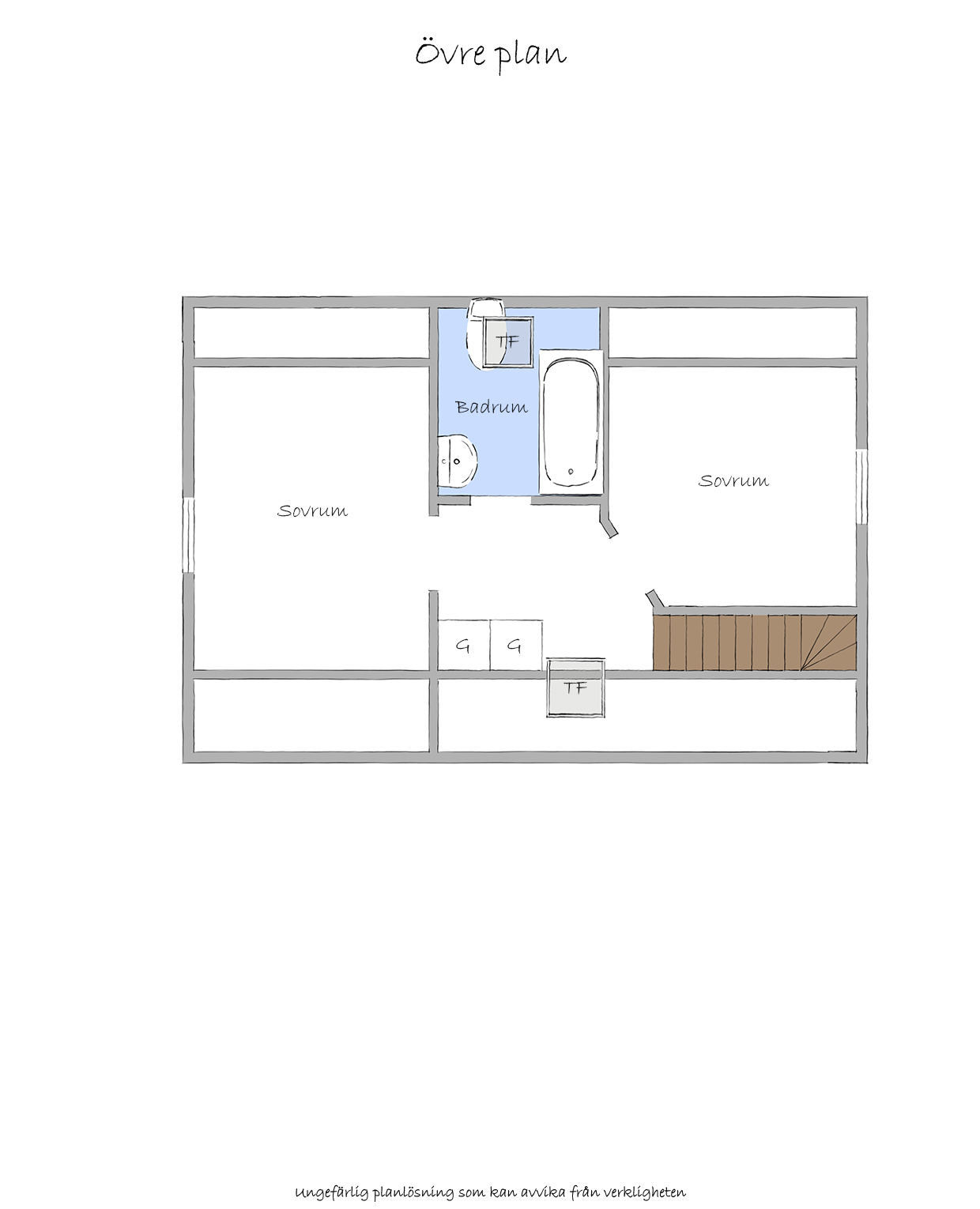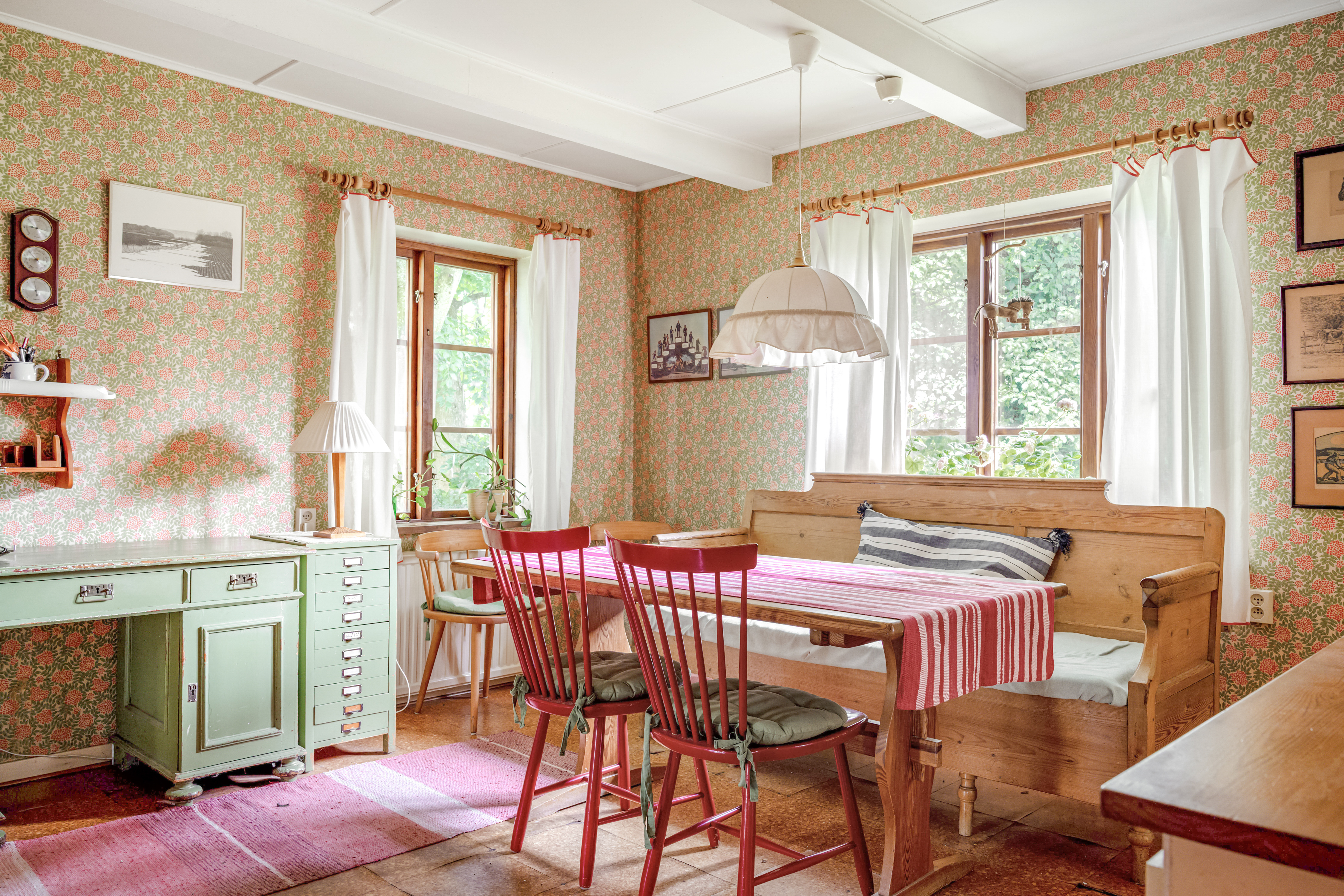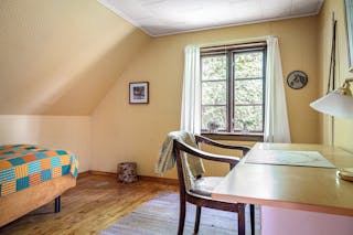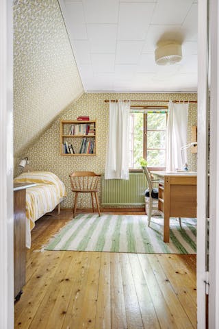 En trappa upp finns två sovrum med snedtak som bidrar till en ombonad känsla. Trägolv och tapetserade väggar.
