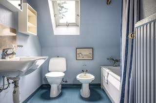 Badrummet på ovanplan har ljusblå färgsättning och takfönster. Utrustat med toalett, handfat, bidé och badkar. Välhållet.
