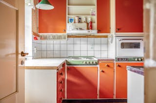 Välkomnande entré med plats för avhängning. Från hallen nås husets hjärta, det charmiga köket med retrokaraktär. Här finns gott om förvaringsmöjligheter och arbetsytor samt utrymme för en mindre matplats. Maskinell utrustning i form av ugn, kyl, spis samt spisfläkt. Plastmatta och tapetserade väggar, utsikt över gårdsplan och stallet. Fläkten fungerar inte längre. Ugnen är helt fungerande, på spisen är det någon platta som inte fungerar helt.