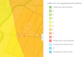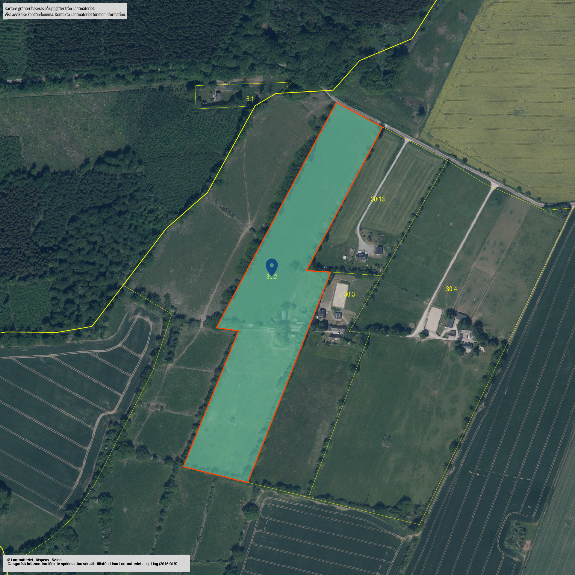 Total areal om 7,11 hektar. Uppdelat på två jordbruksblock på 3,95 hektar samt 2,71 hektar. Åkermarken är klassad som permanent gräsmark. Övrig areal är i huvudsak tomtyta. Åkermarken har jordklass 6 samt 7.