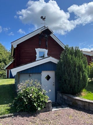 Uthusbyggnad uppförd i timmer med betonggolv. Betongtegel på tak (2010). Bya ca 25 kvm.