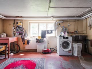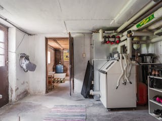 Källare med klassiska utrymmen. Tvättstuga med tvättmaskin och tvättho. WC-rum med tvättställ och WC. Pannrum med elpanna från Nibe till jordvärmen. Ackumulatortank om 500 liter samt hydrofor. Gott om förrådsutrymmen. Från trädgården kan man nå källaren via pannrummet och tvättstugan.