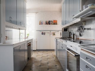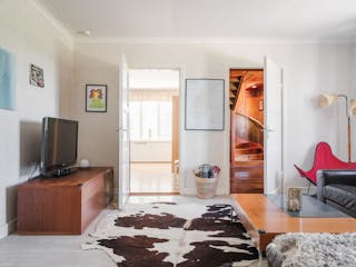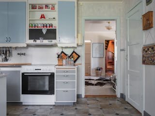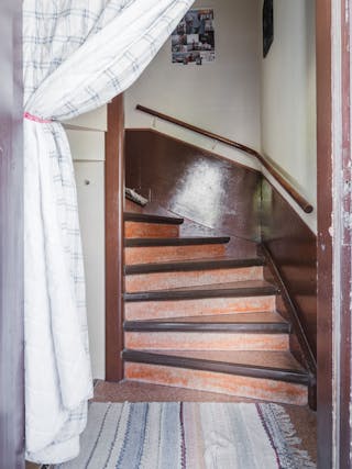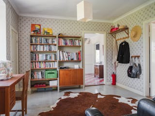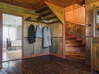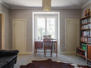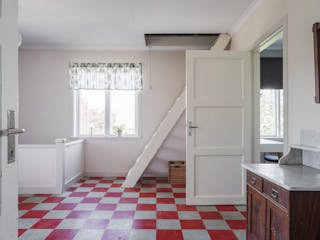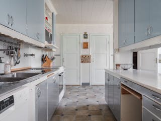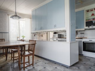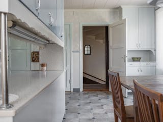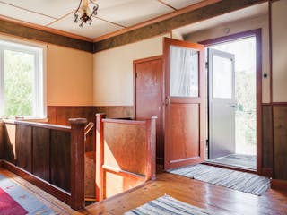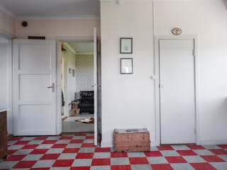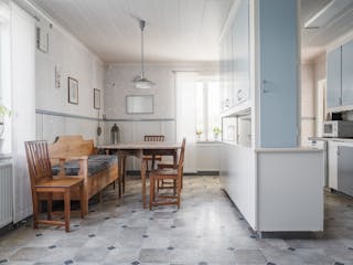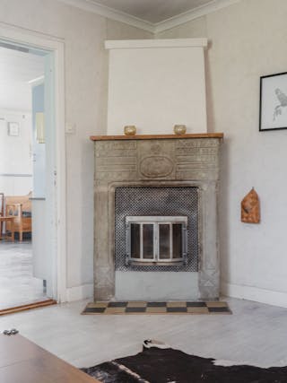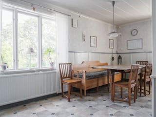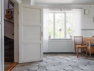 Groventré med trappa till källardelen samt trappa upp till bostadsplanet. Även trappa till övervåningen. Kök med matplats och skafferi, plastmatta på golvet. Köket är utrustat med spis med häll, fläkt samt diskmaskin. Kylen är placerad i skafferiet. Intill skafferiet finns ett litet rum med tvättställ. Kontor/sovrum med klädkammare. Vardagsrum med plastmatta på golvet och en eldstad med Keddyinsats. Vidare når man salen med parkettgolv. Finentré/hall med trägolv och trappa till övervåningen. Förvaring under trappan.